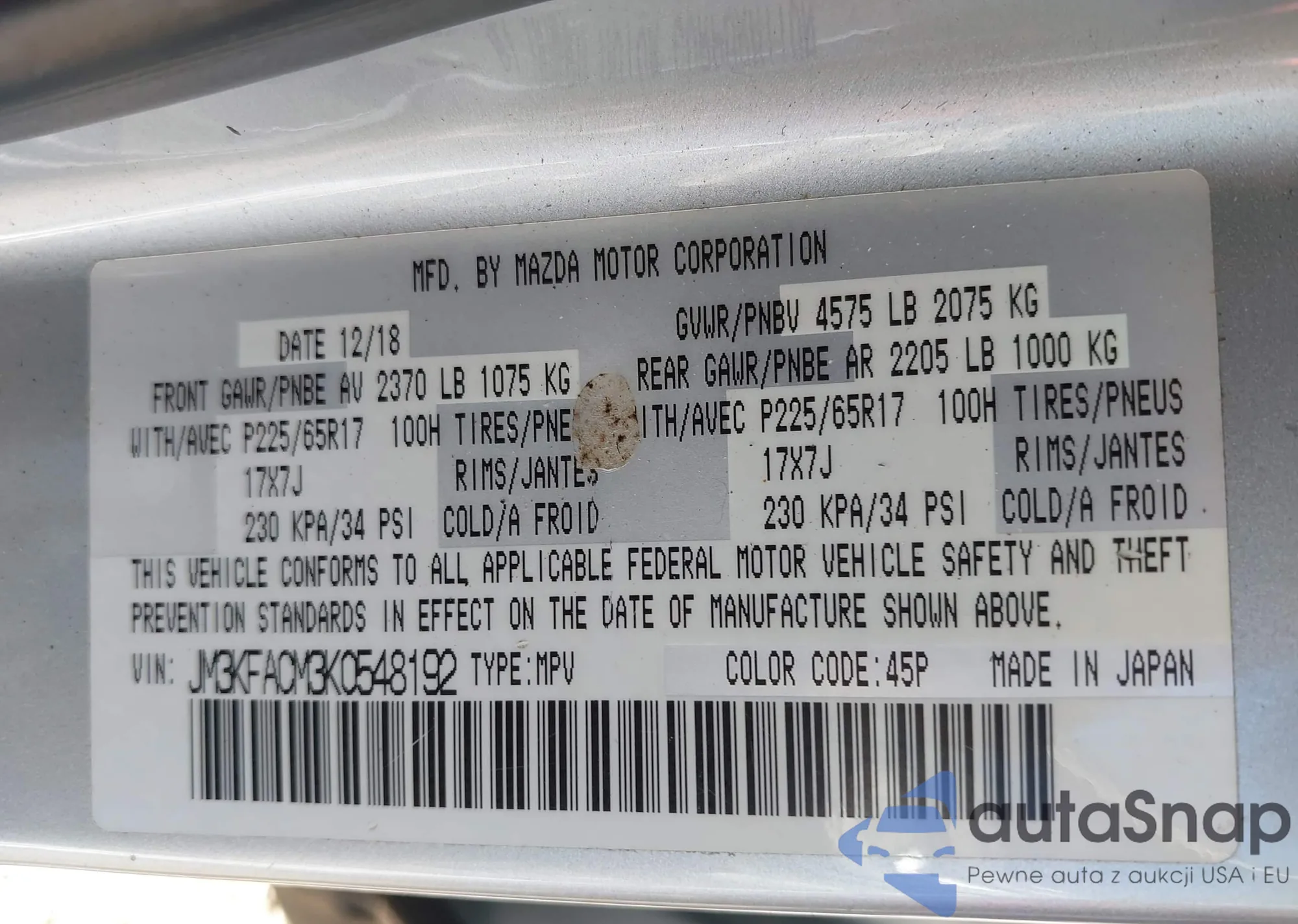 LOT: 43990739 VIN: JM3KFACM3K0548192