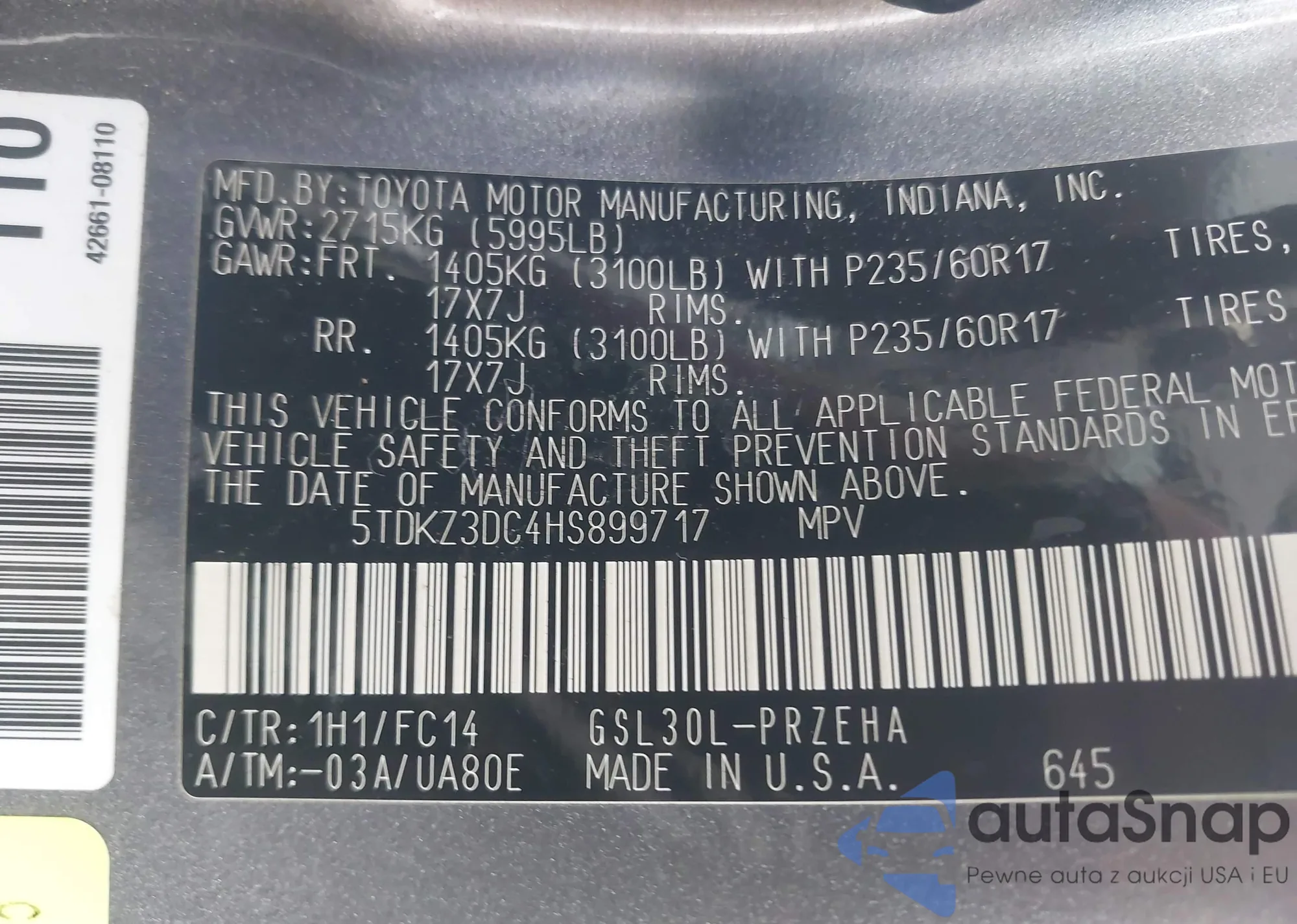 • VIN 5TDKZ3DC4HS899717