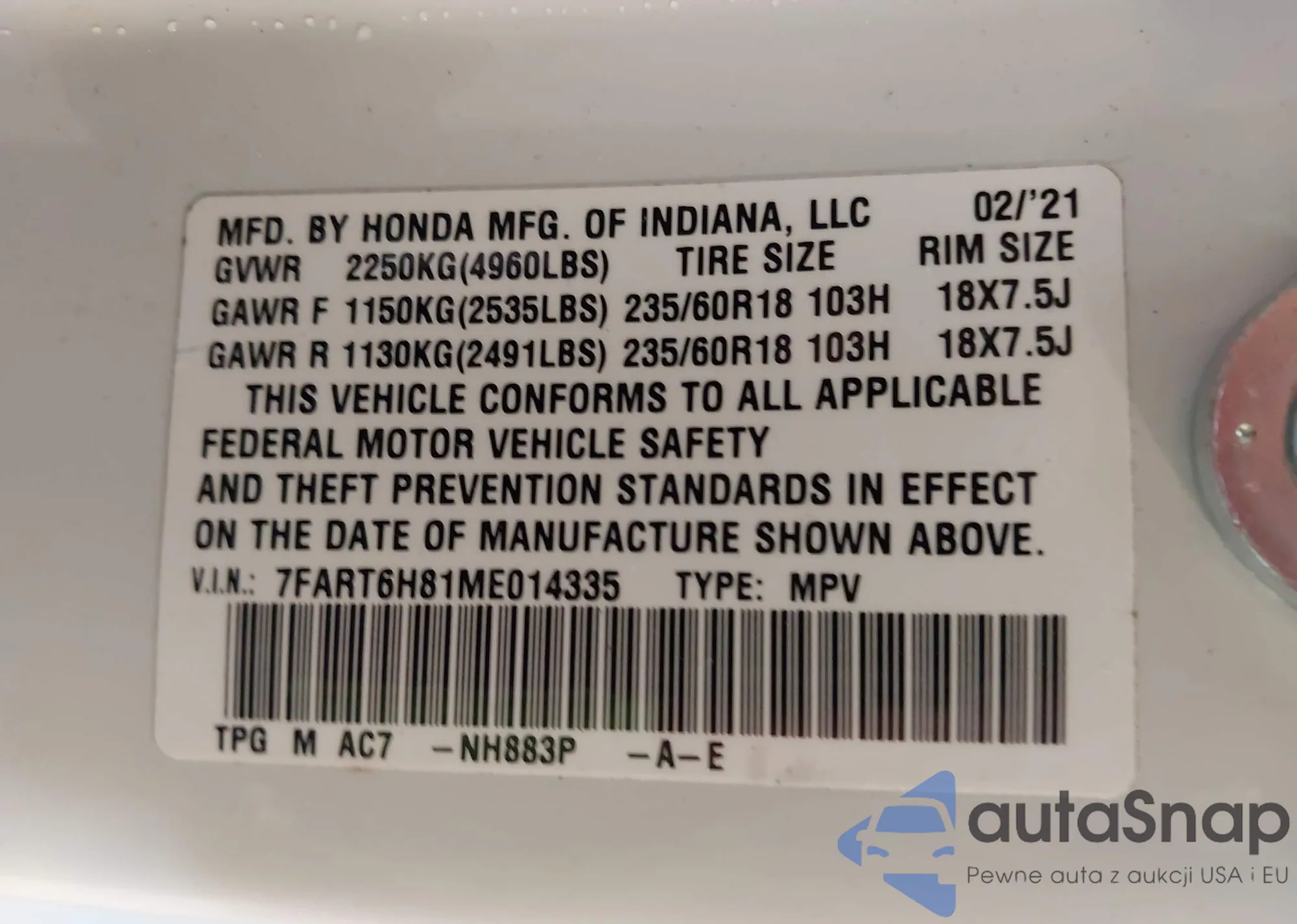 LOT: 43911439 VIN: 2HKYF18486H559922
