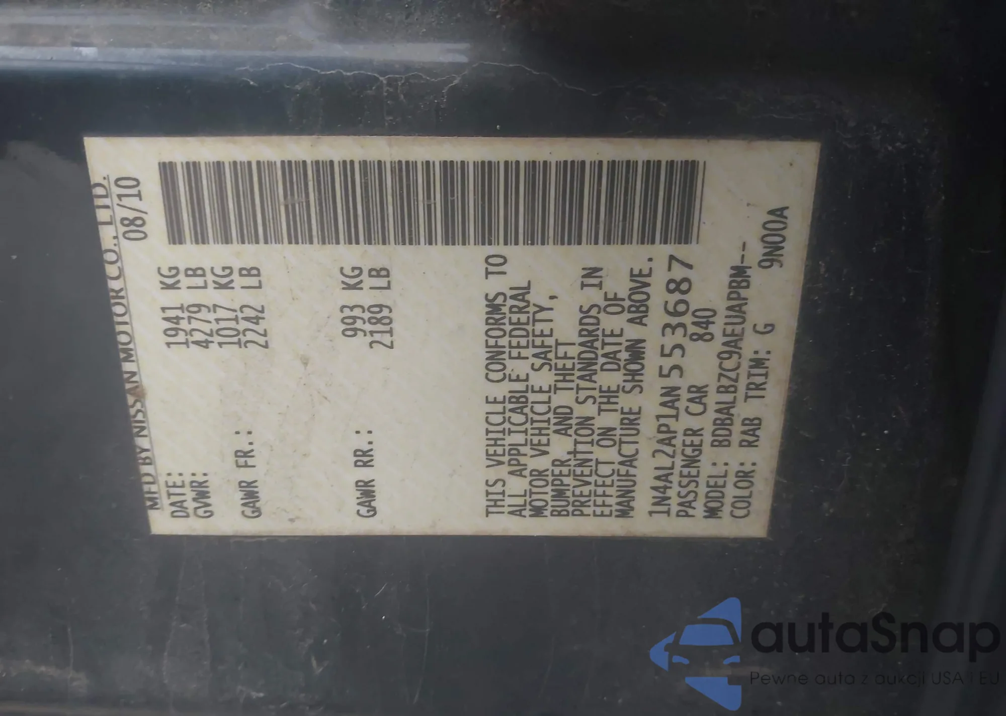 LOT: 43627011 VIN: 1N4AL2AP1AN553687