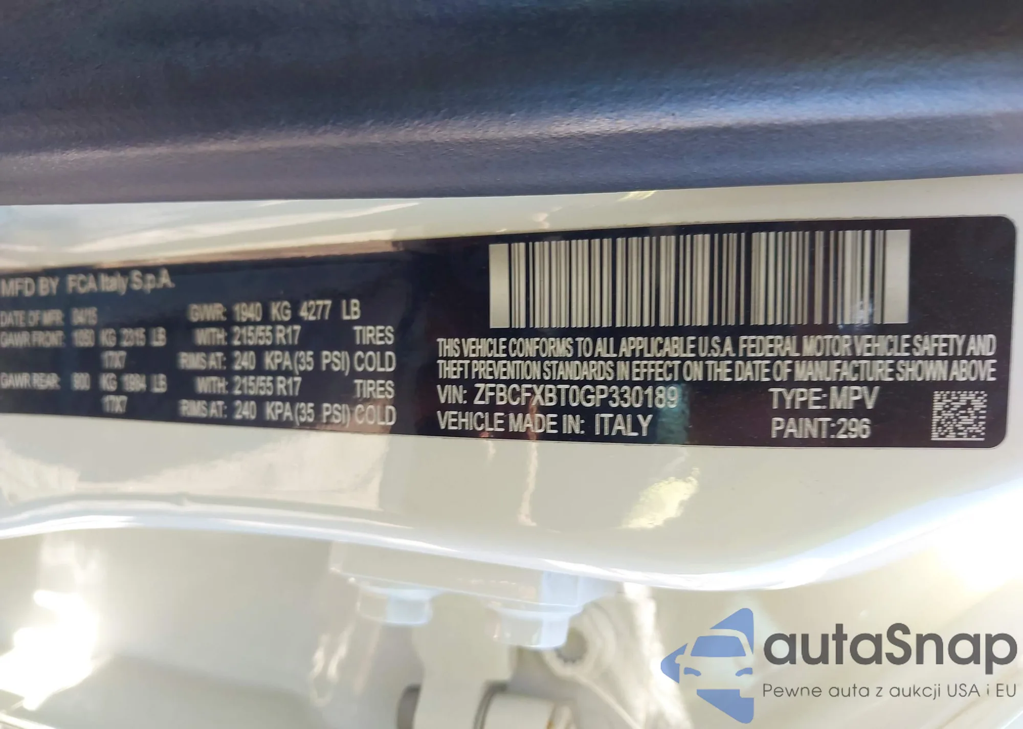 LOT: 43709872 VIN: ZFBCFXBT0GP330189