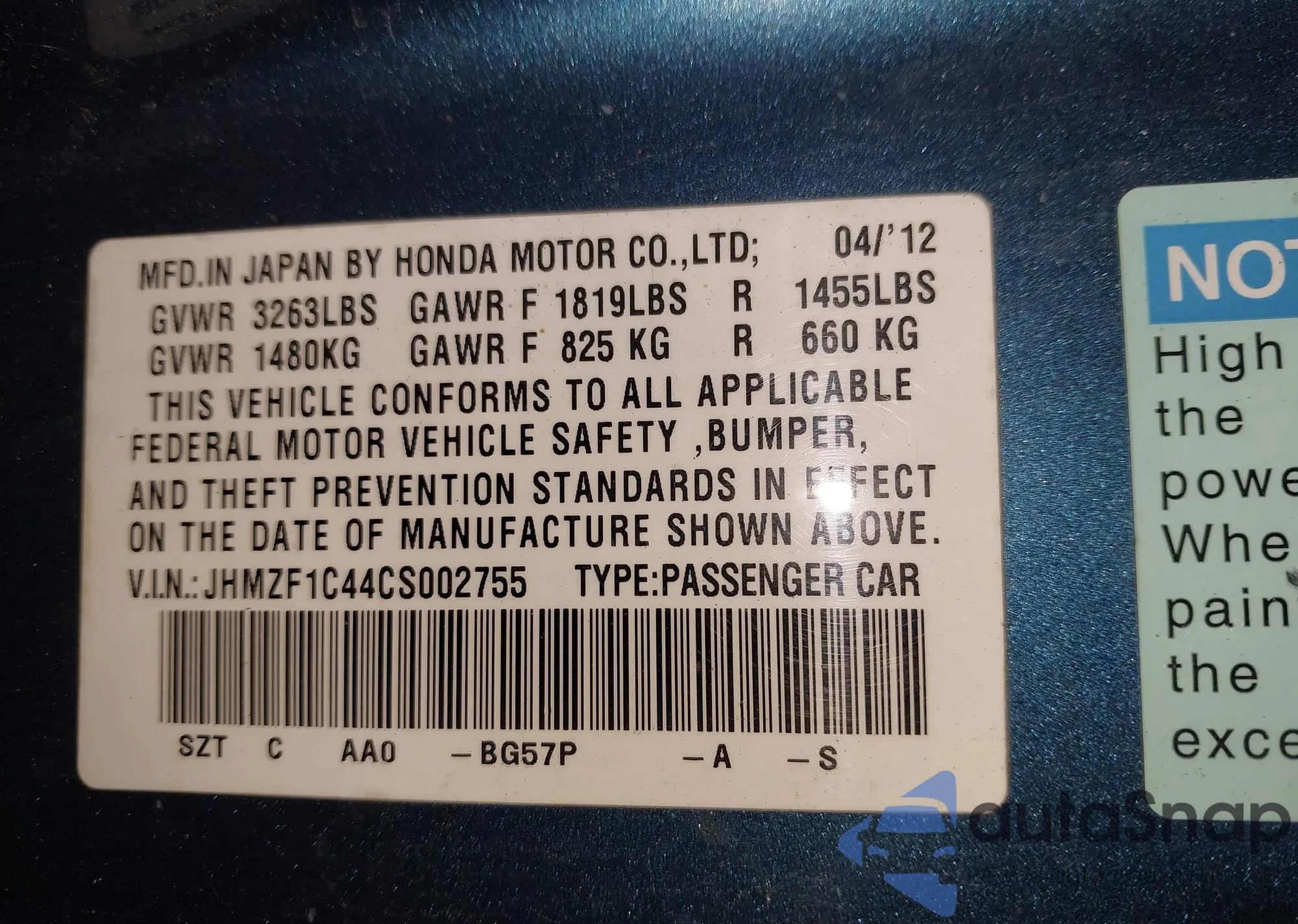 • VIN JHMZF1C44CS002755