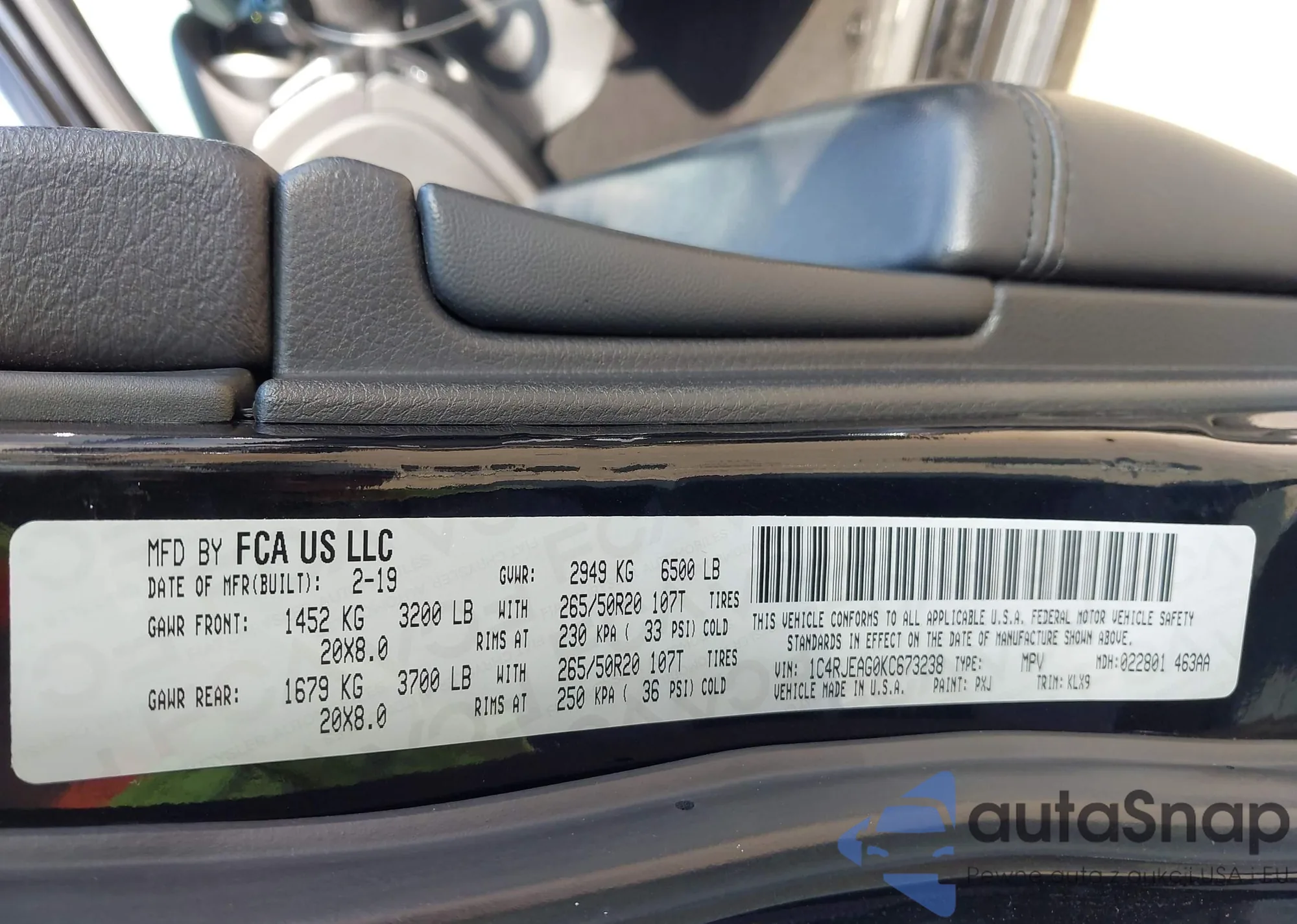 • VIN 1C4RJEAG0KC673238