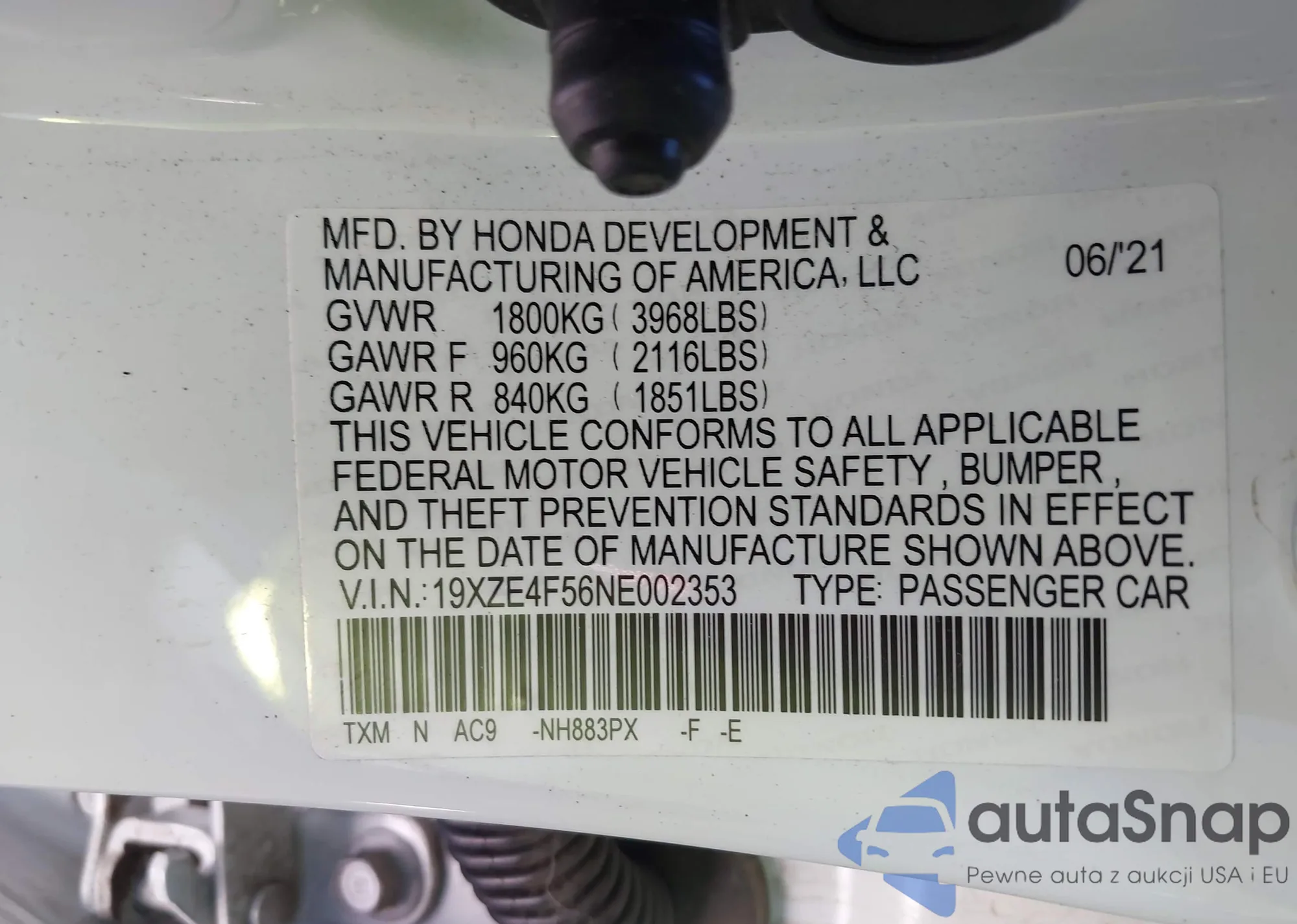 LOT: 43793839 VIN: 19XZE4F56NE002353