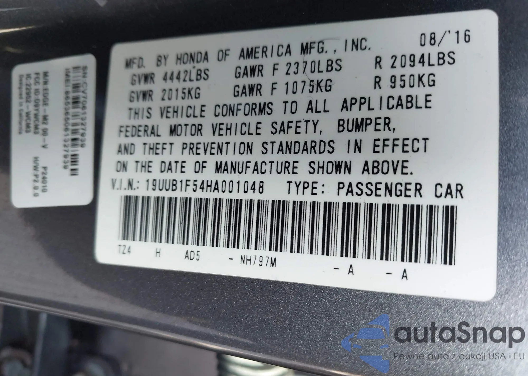 LOT: 43759375 VIN: 19UUB1F54HA001048
