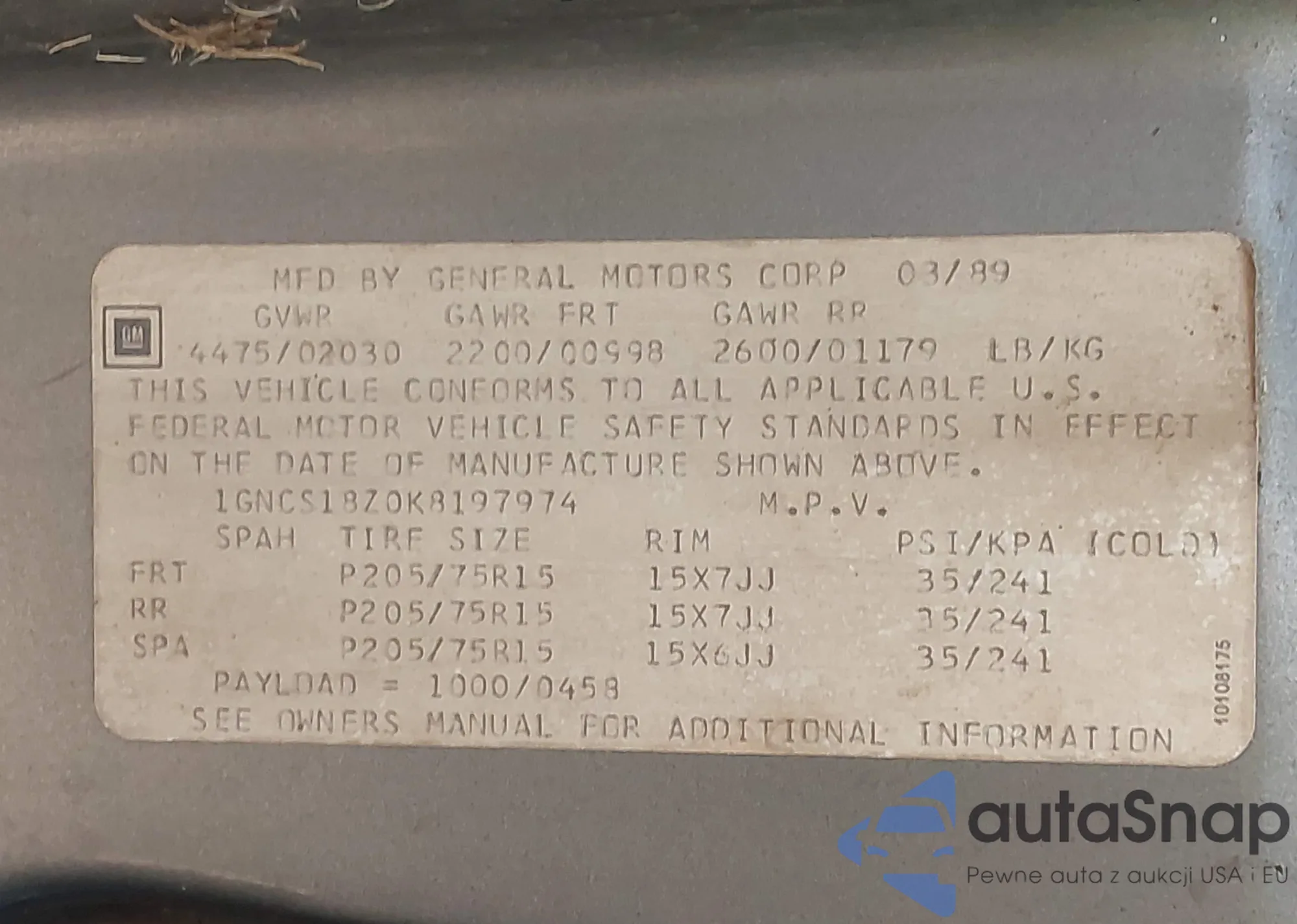 • VIN 1GNCS18Z0K8197974