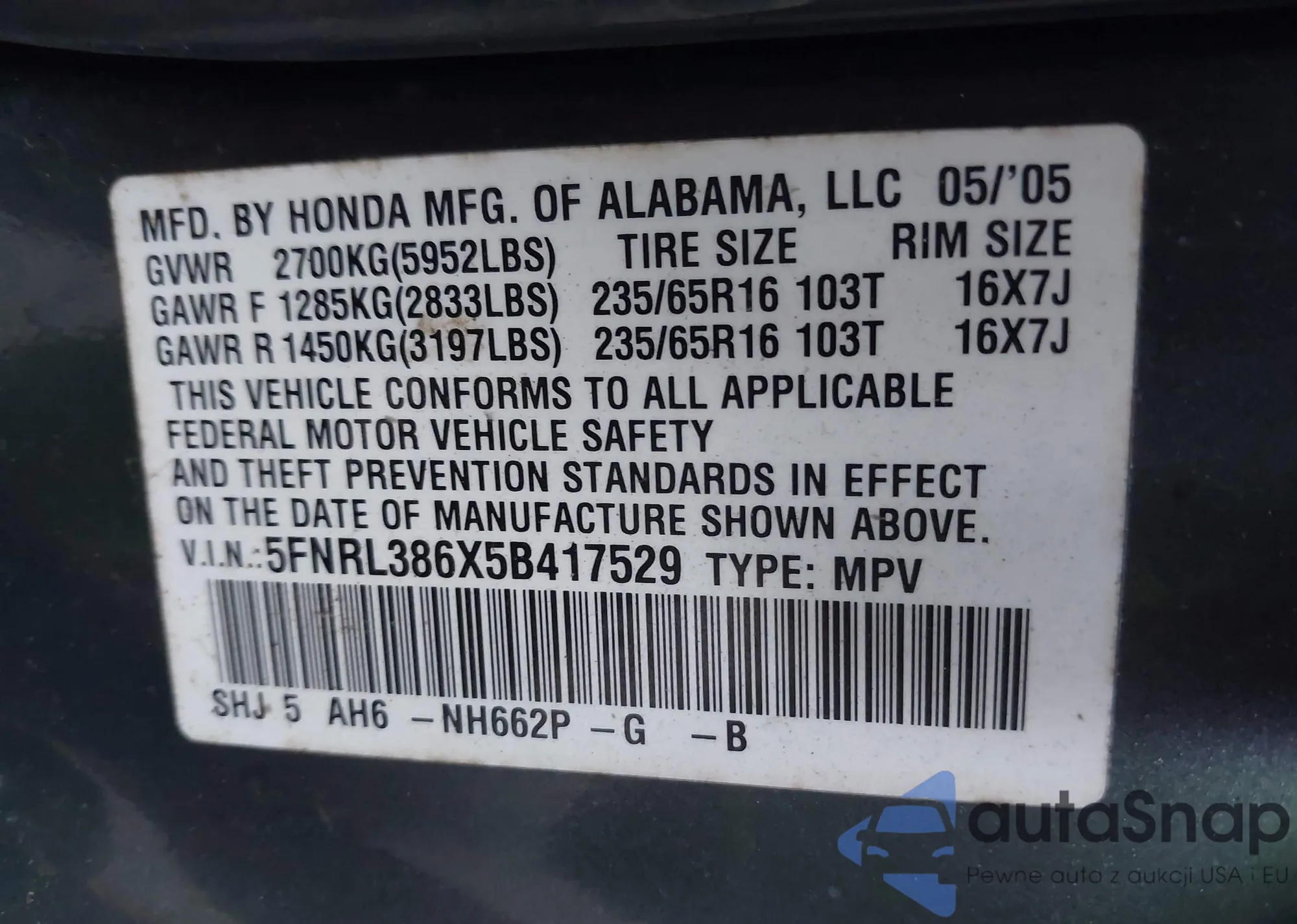 • VIN 5FNRL386X5B417529