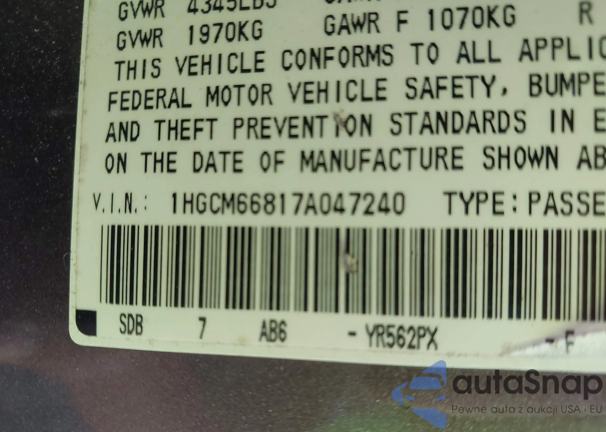 LOT: 43478624 VIN: 1HGCM66817A047240
