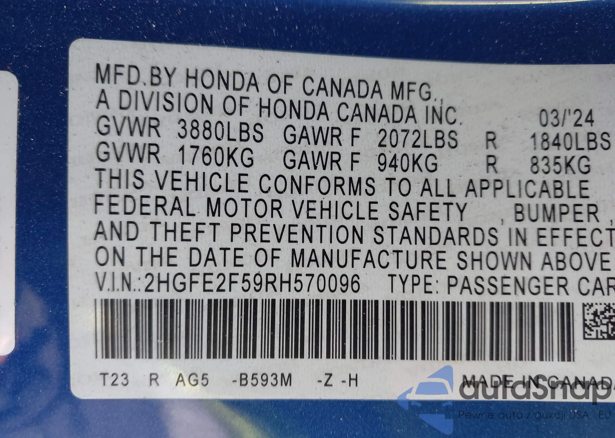 LOT: 43497900 VIN: 2HGFE2F59RH570096