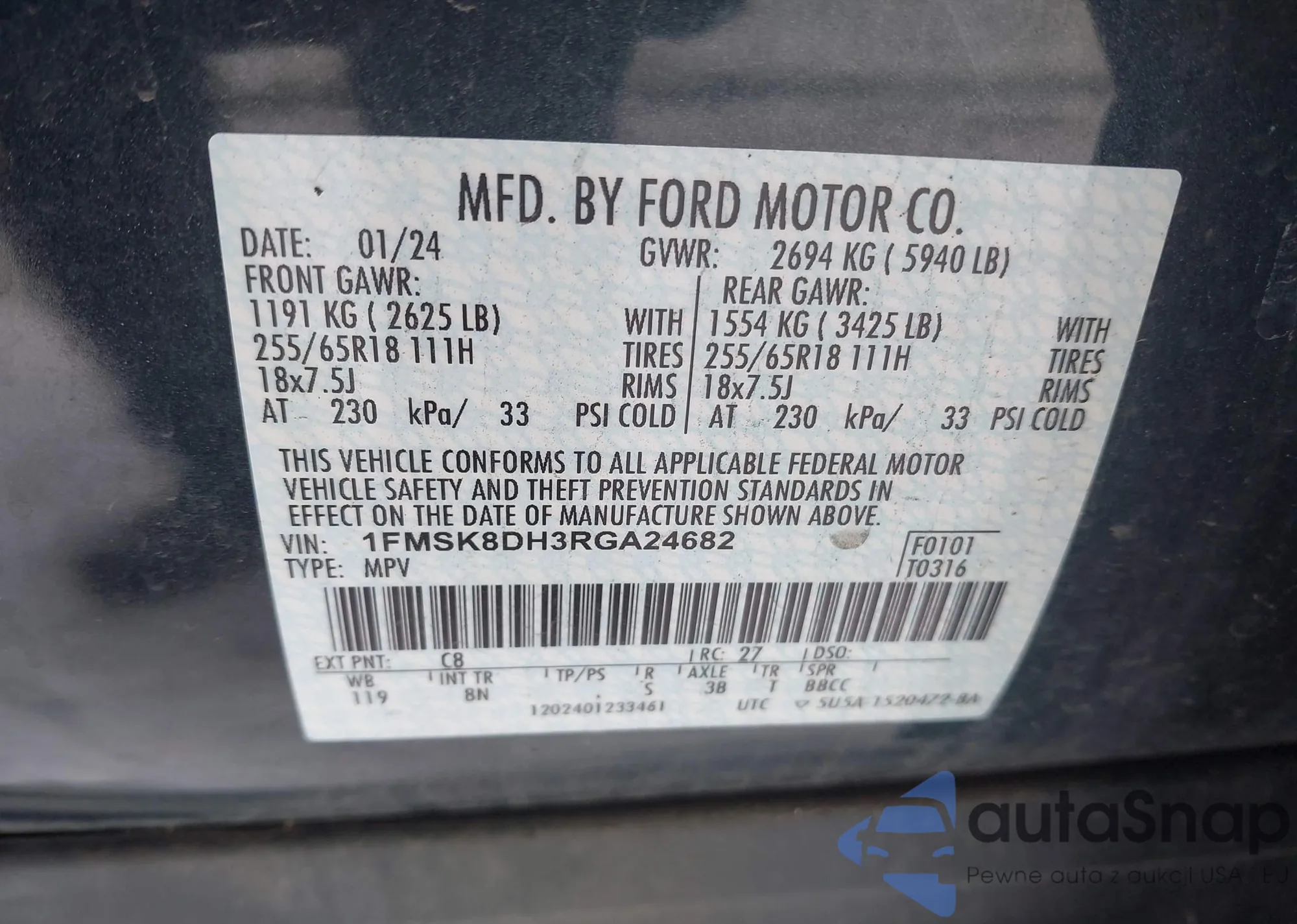 • VIN 1FMSK8DH3RGA24682