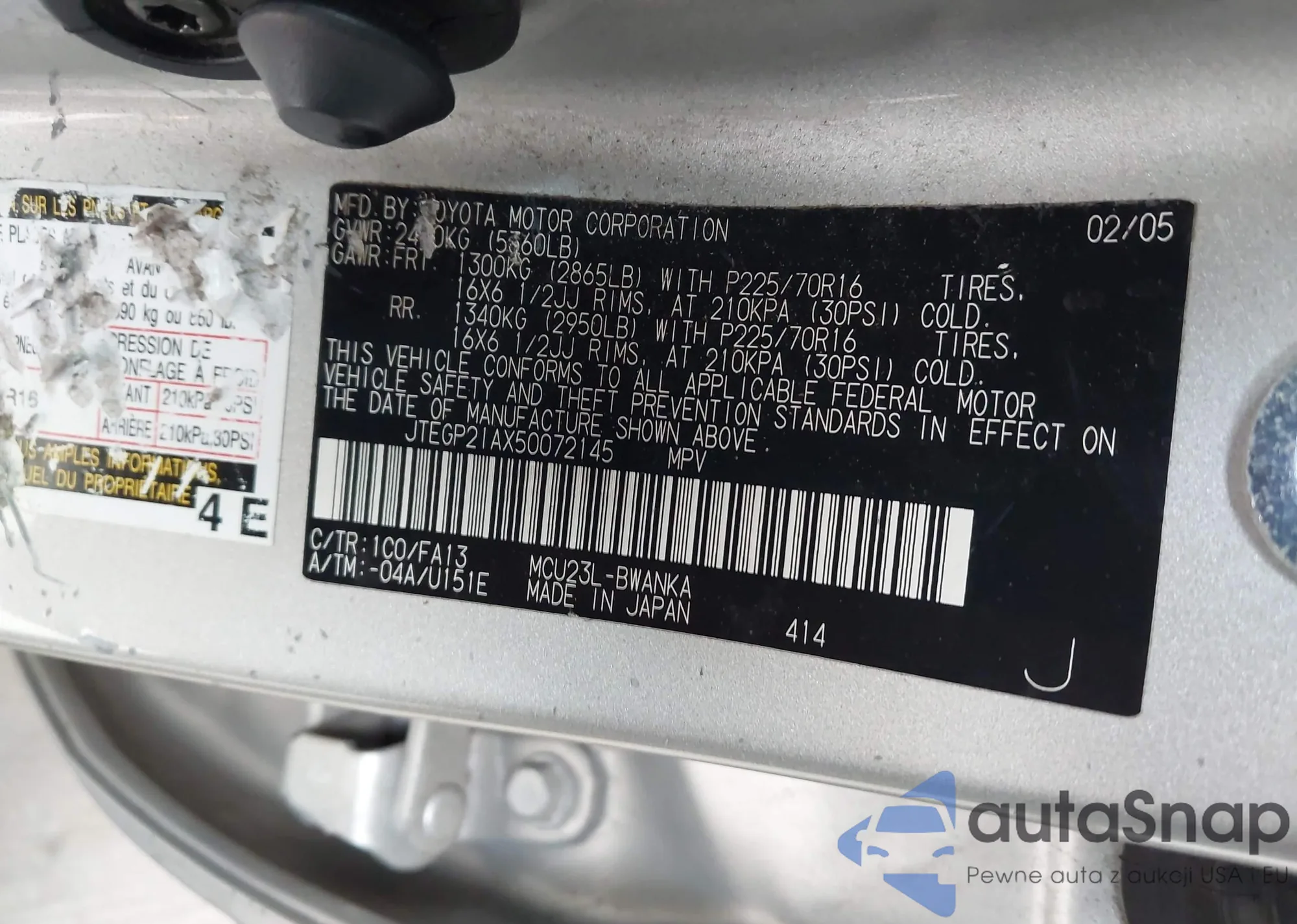 LOT: 43815764 VIN: JTEGP21AX50072145