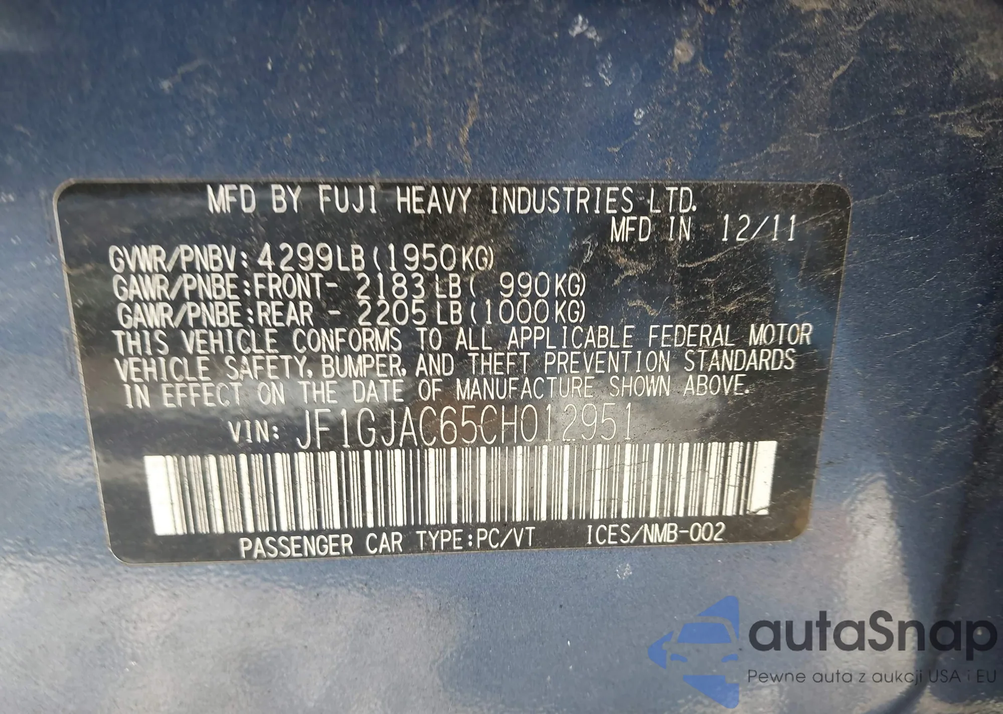 LOT: 43865016 VIN: JF1GJAC65CH012951