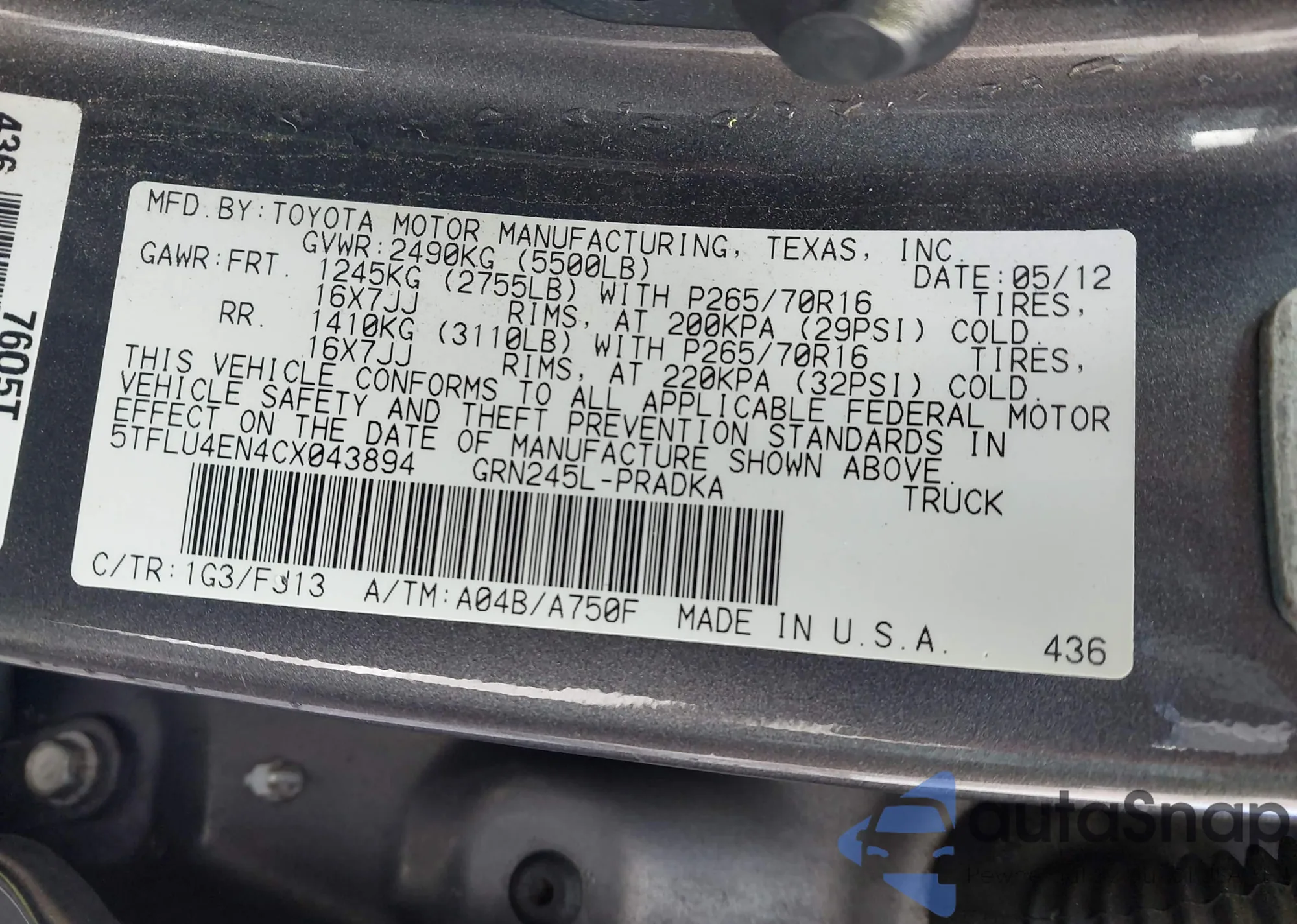 • VIN 5TFLU4EN4CX043894