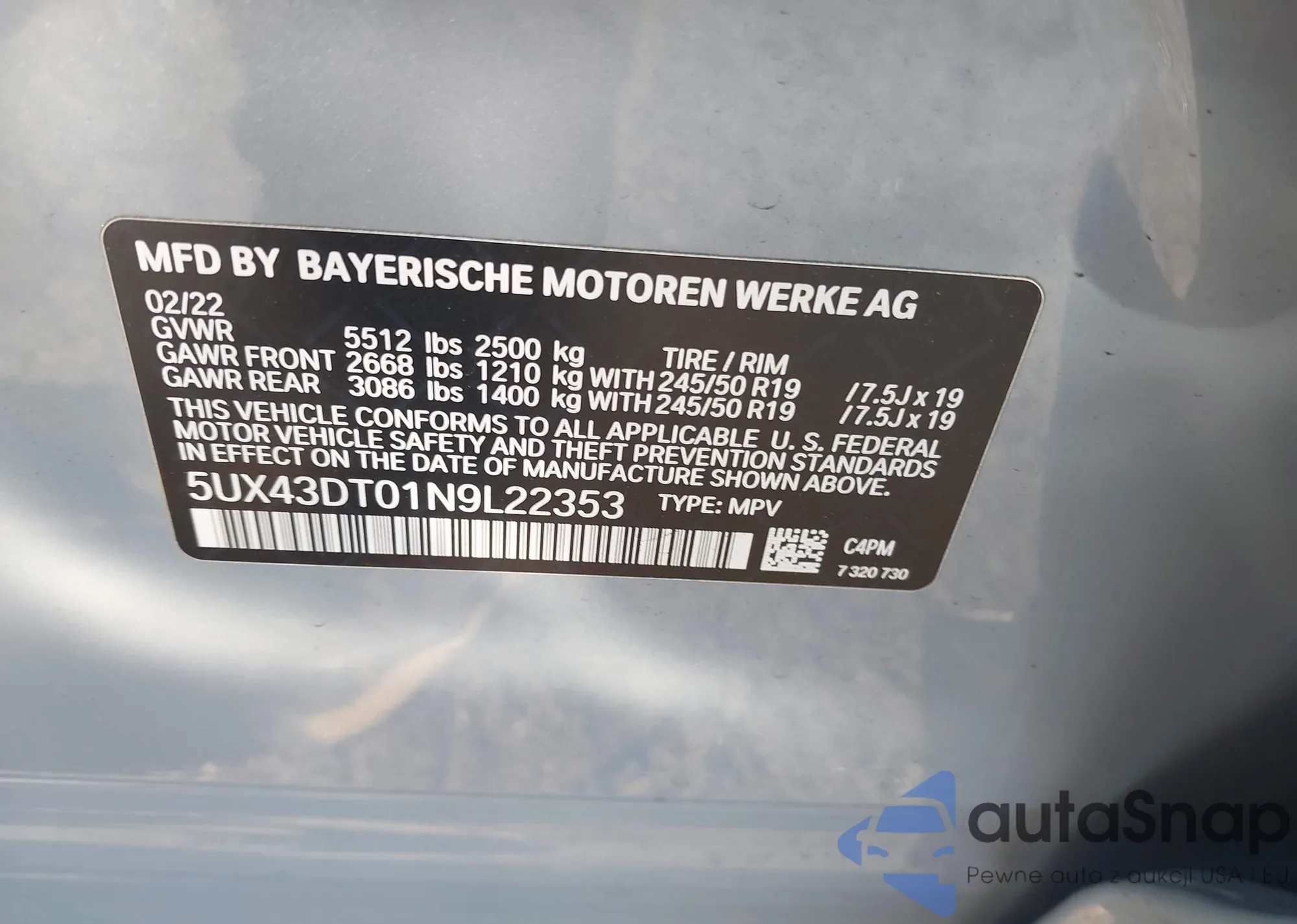LOT: 43754237 VIN: 5UX43DT01N9L22353