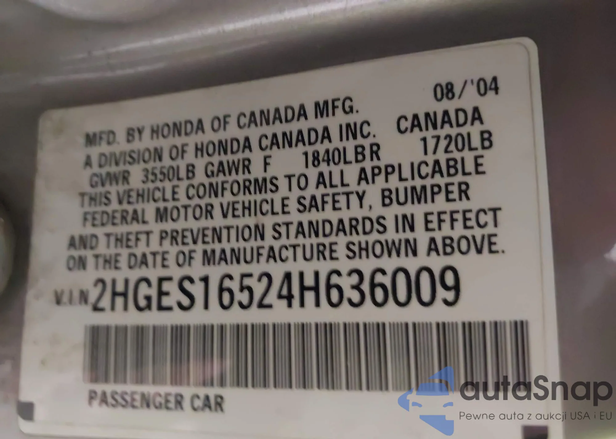 LOT: 43820978 VIN: 2HGES16524H636009