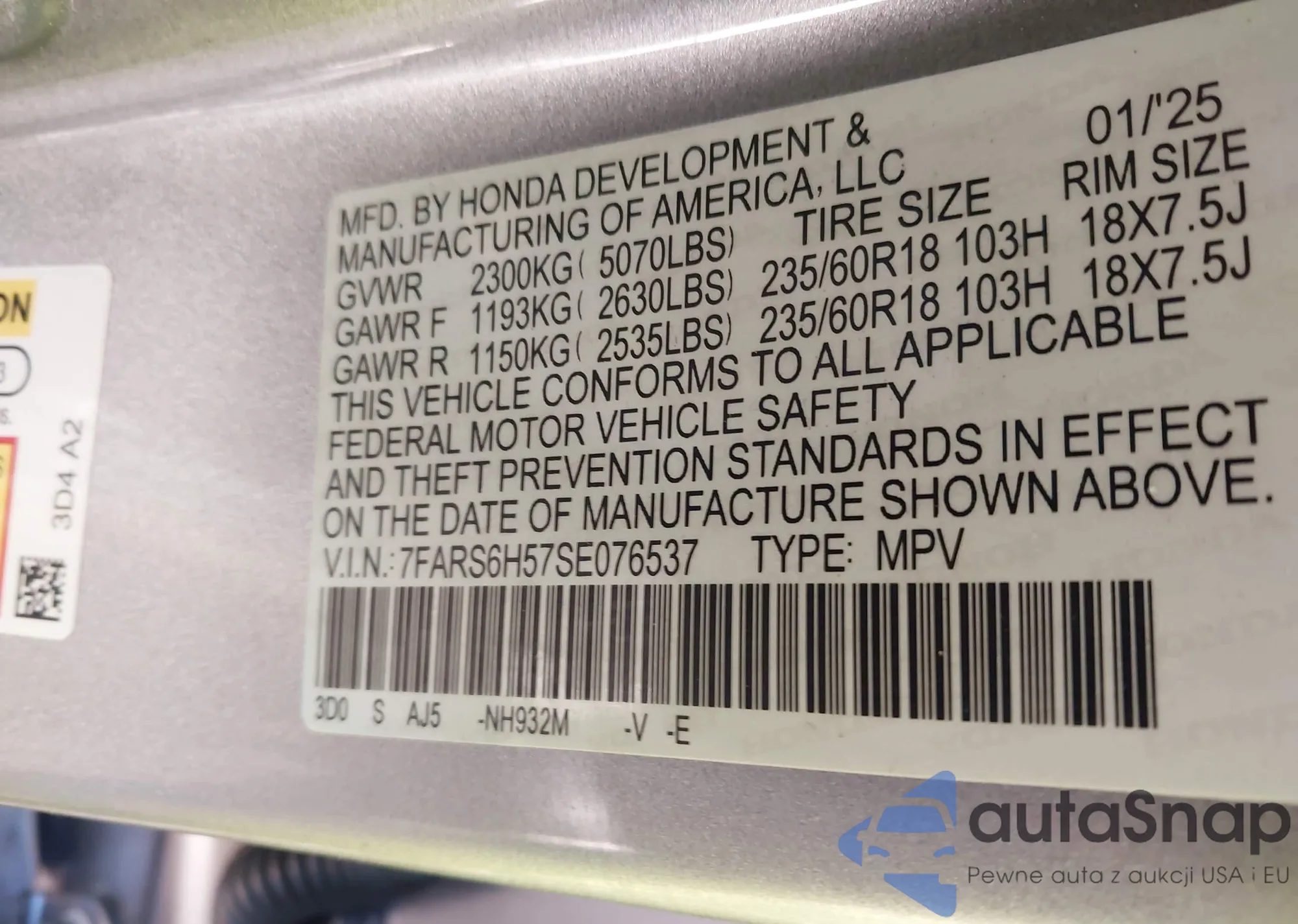LOT: 43603921 VIN: 7FARS6H57SE076537