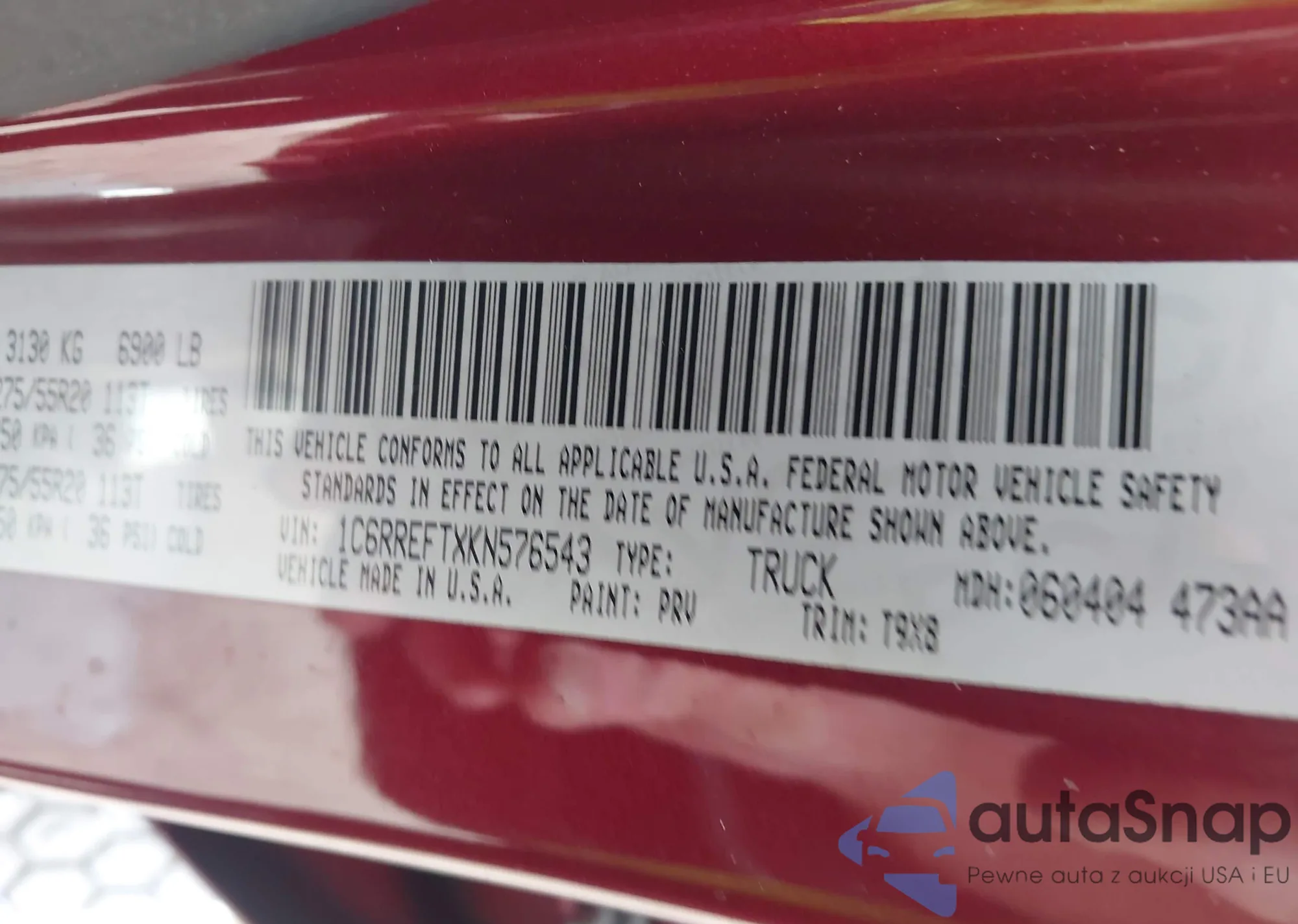 LOT: 43787029 VIN: 1C6RREFTXKN576543