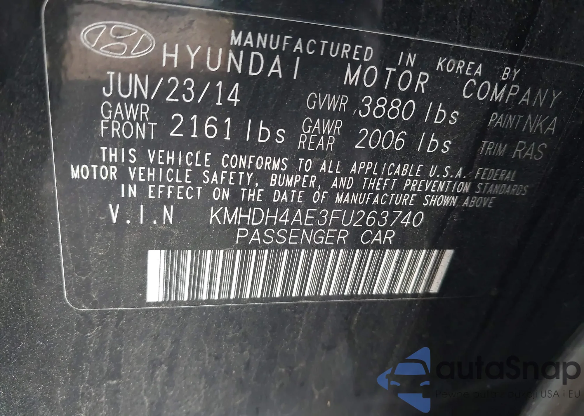 • VIN KMHDH4AE3FU263740