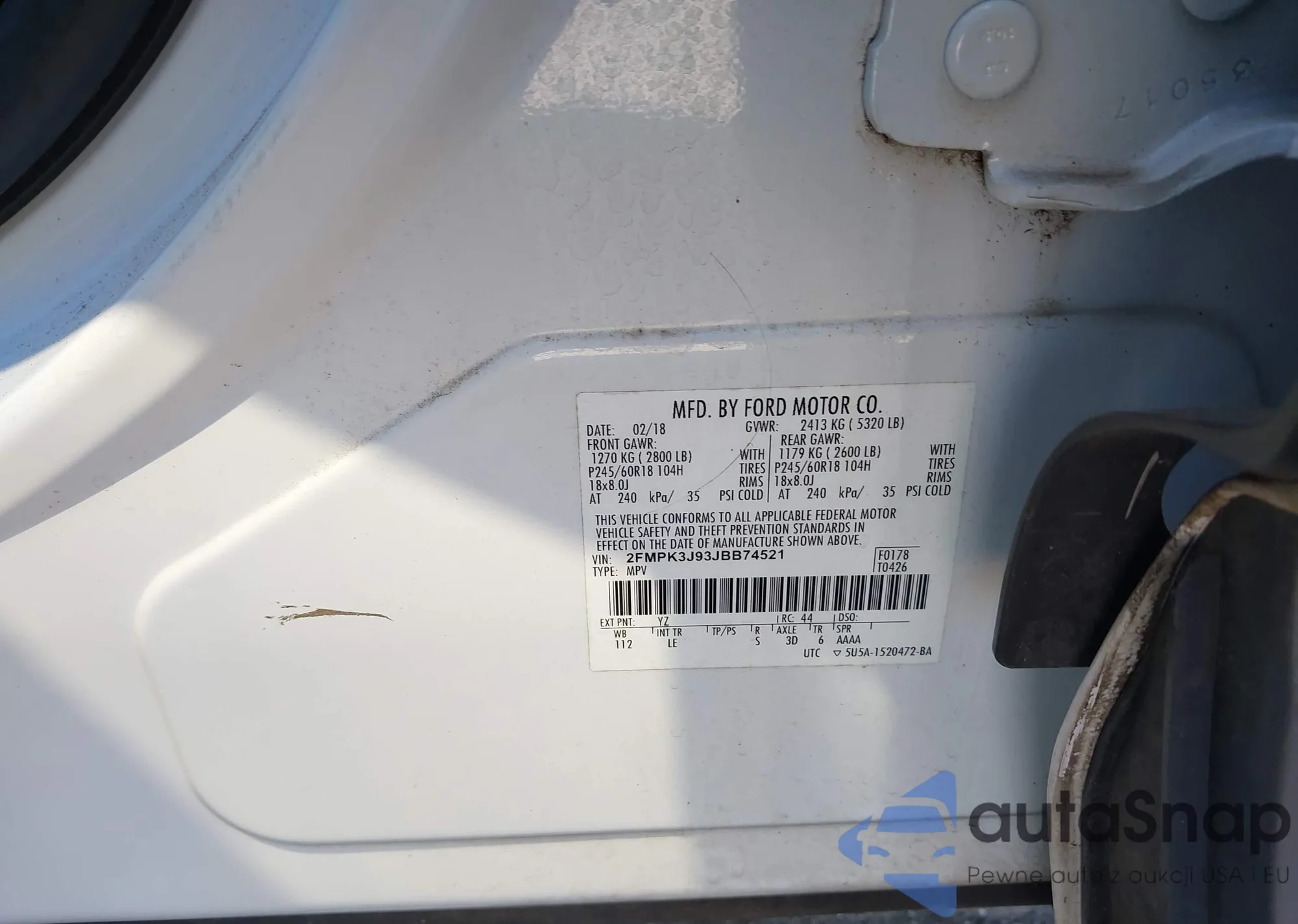 LOT: 43298898 VIN: 2FMPK3J93JBB74521