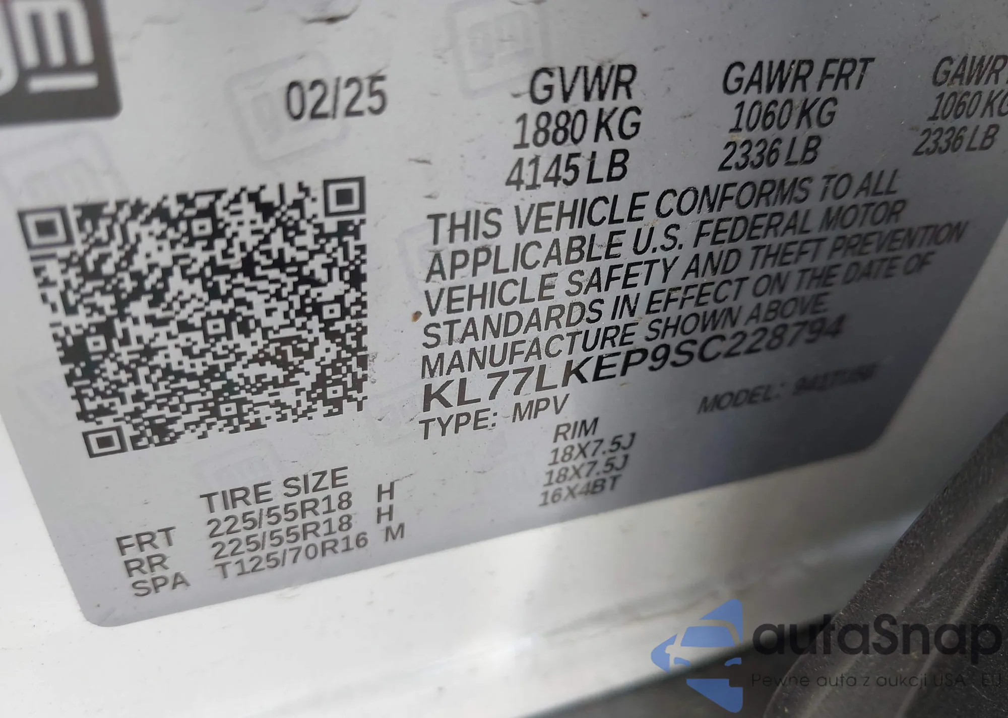 • VIN KL77LKEP9SC228794