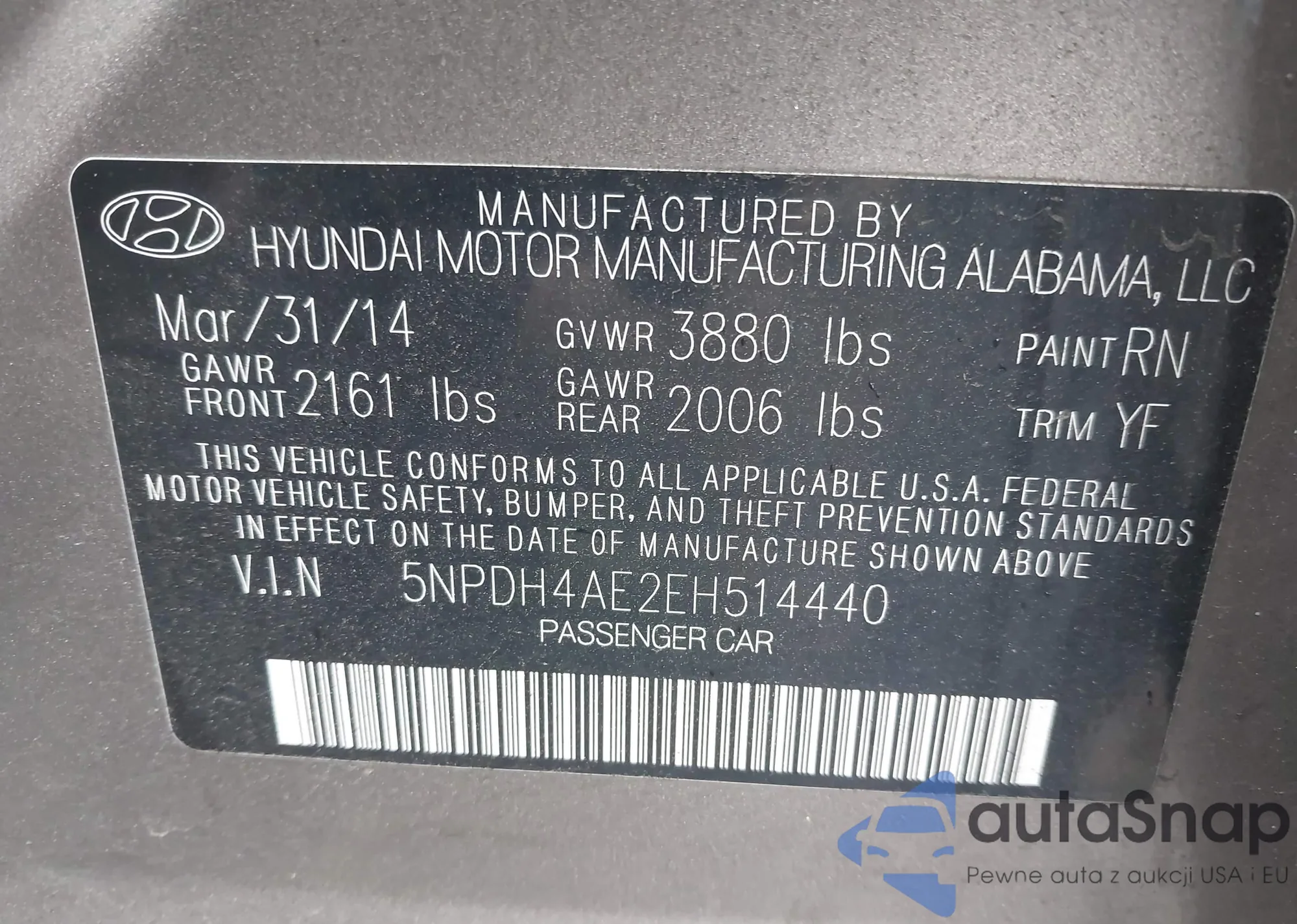 LOT: 43447658 VIN: 5NPDH4AE2EH514440