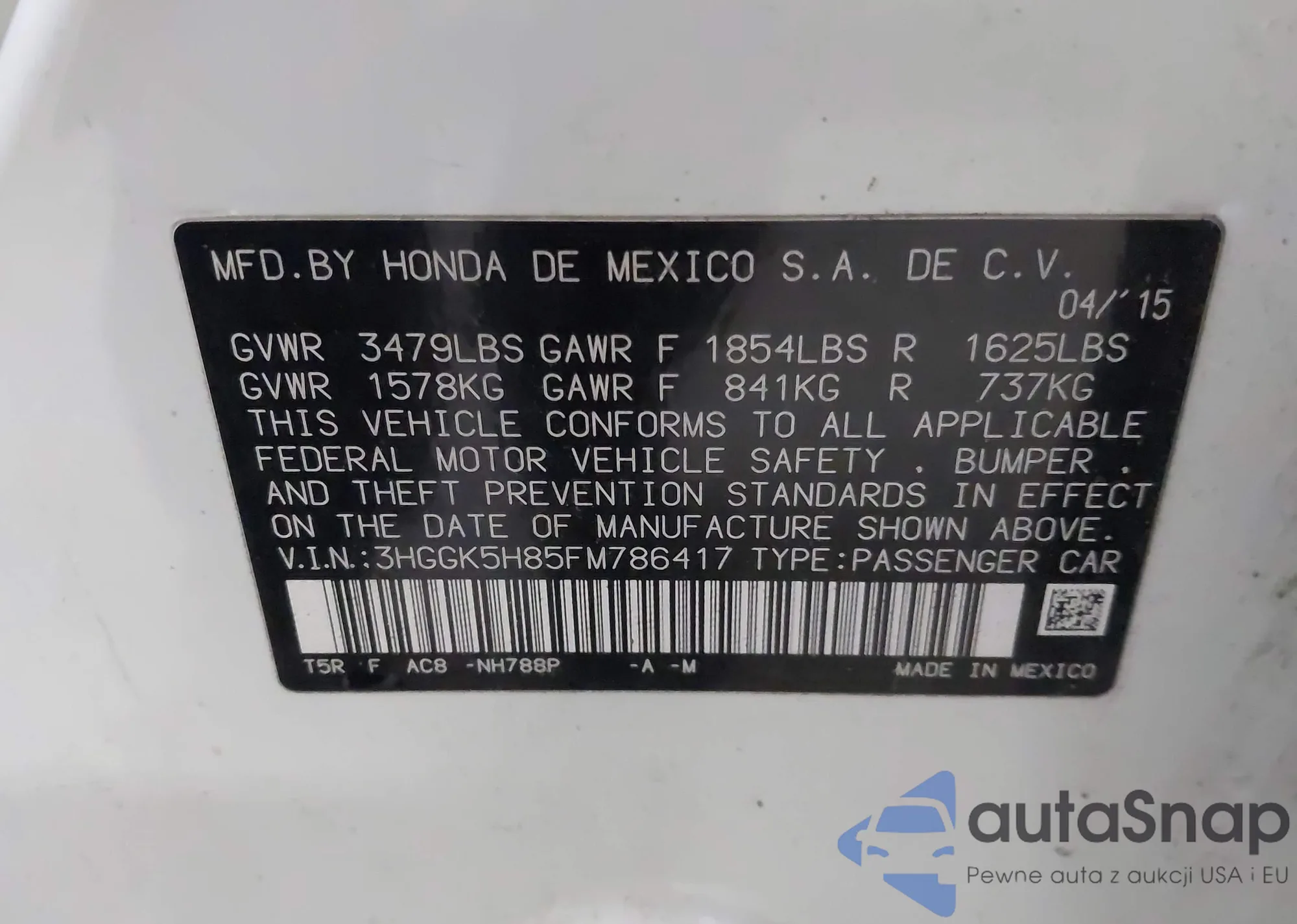 • VIN 3HGGK5H85FM786417