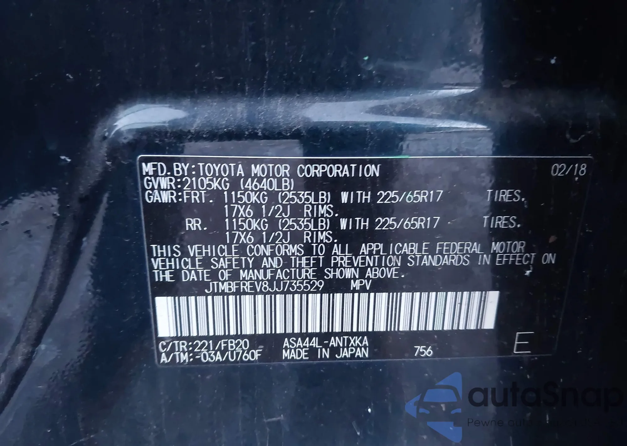 LOT: 43796268 VIN: JTMBFREV8JJ735529