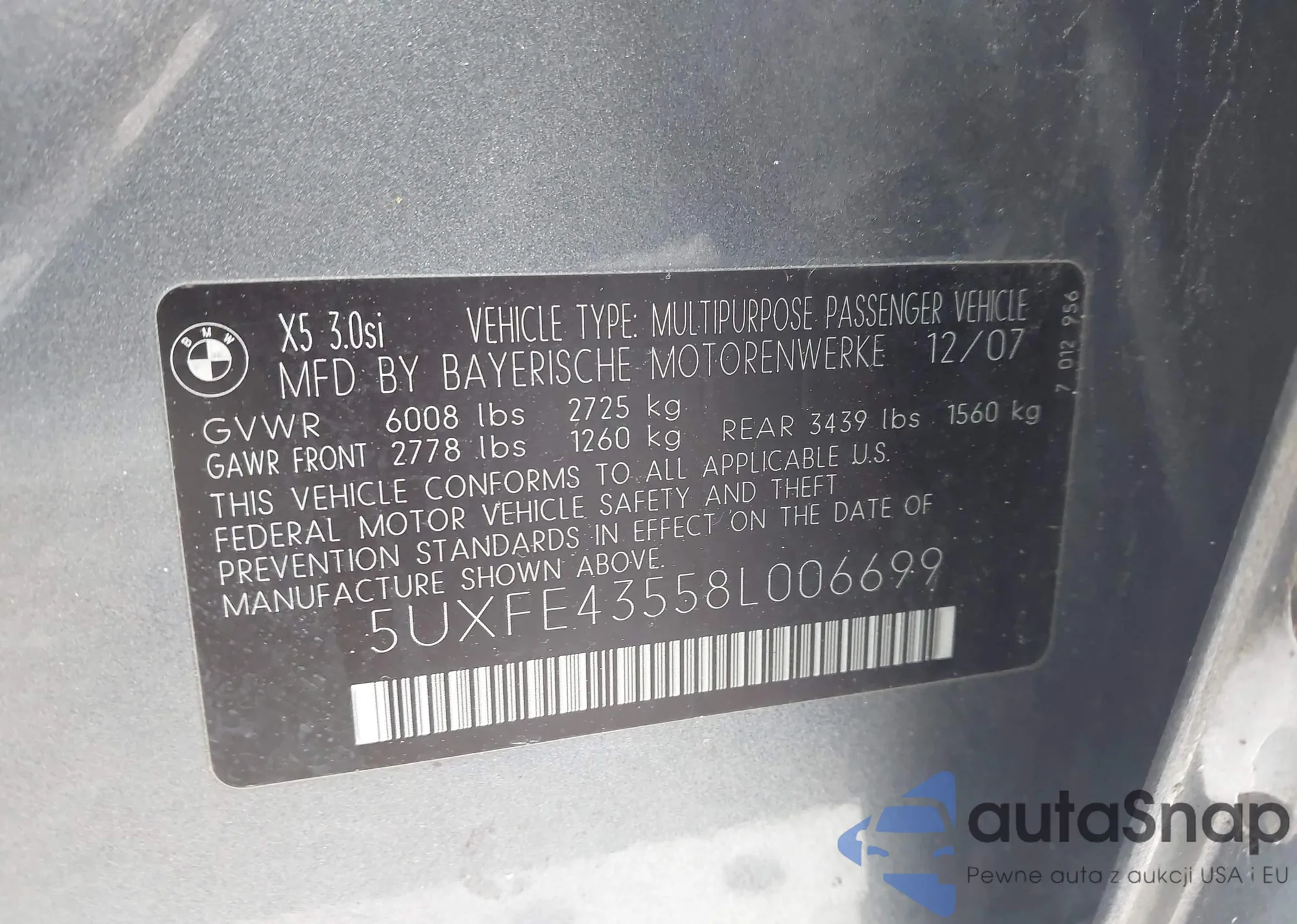 2008 BMW X5 3.0Si z USA, uszkodzony, nr VIN 5UXFE43558L006699