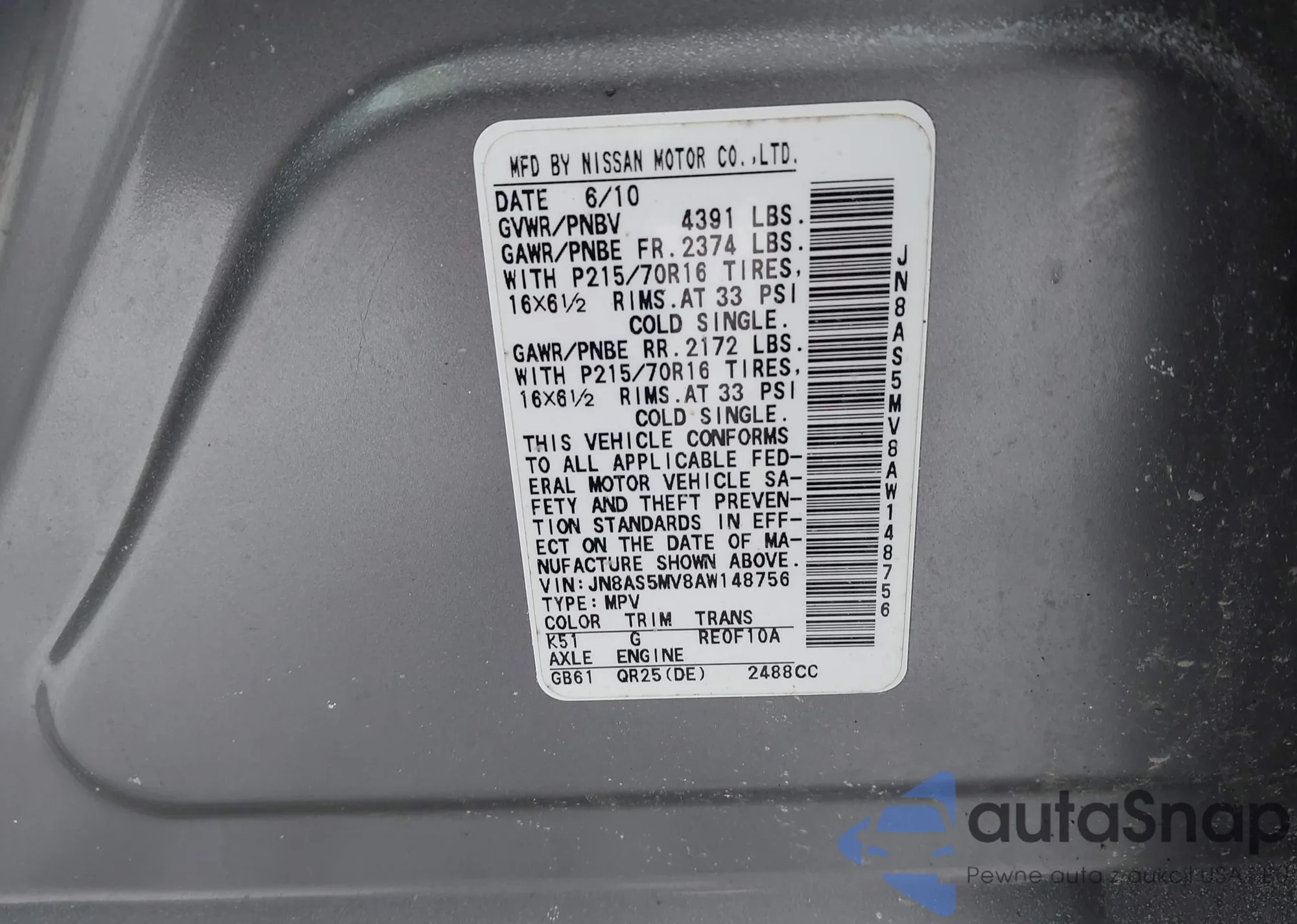 • VIN JN8AS5MV8AW148756