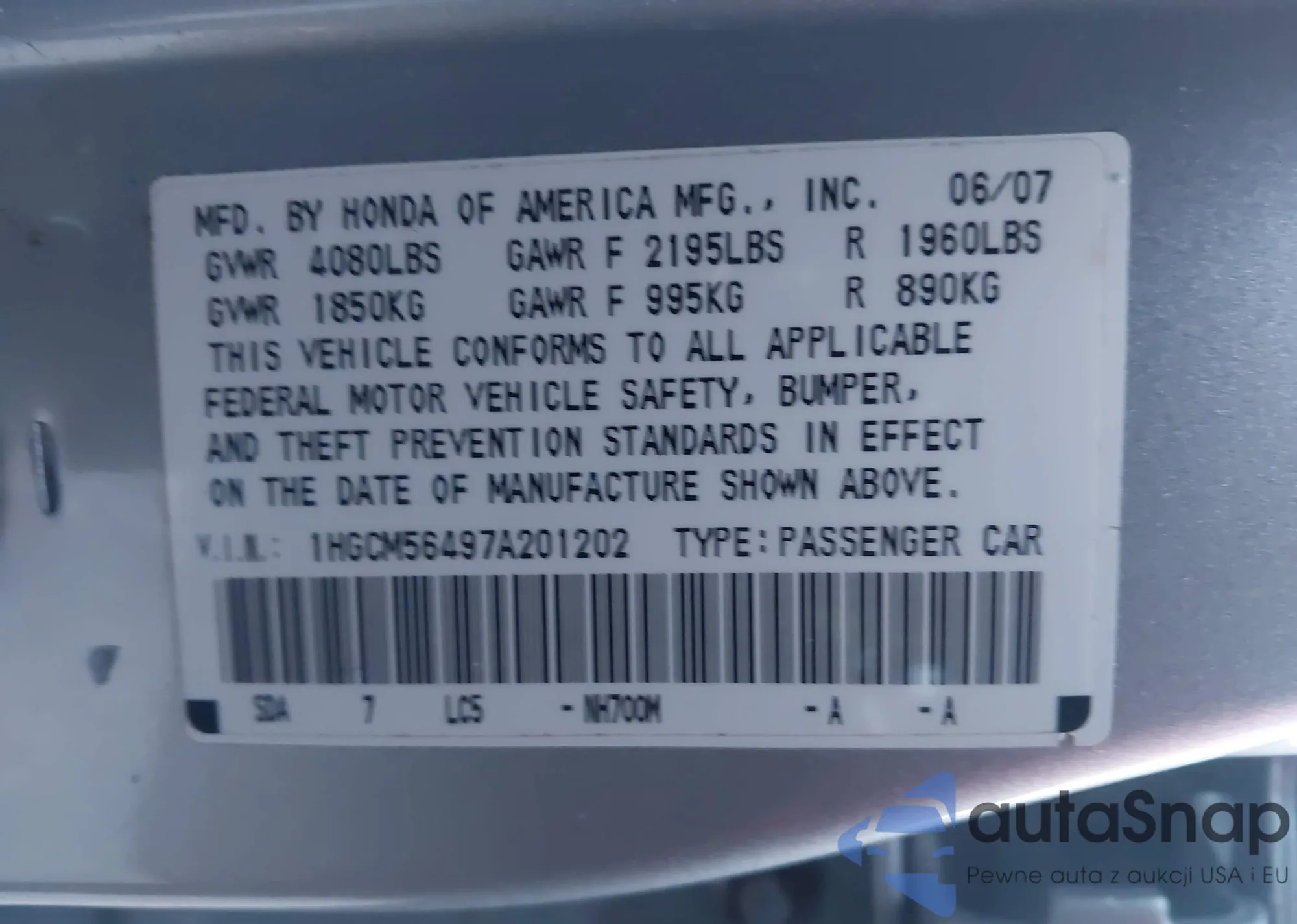 LOT: 43930291 VIN: 5J6RW2H57NA013289