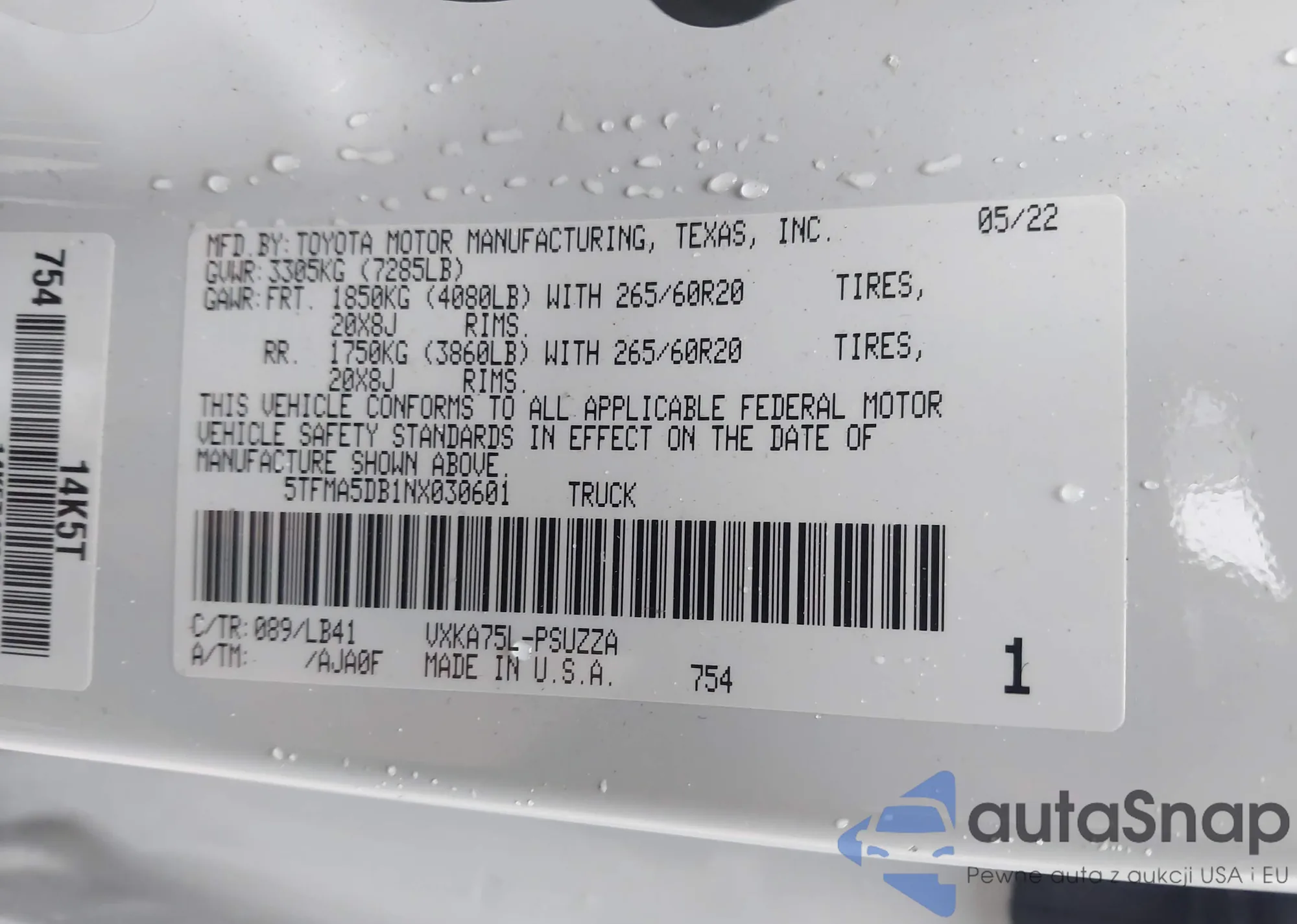 • VIN 5TFMA5DB1NX030601