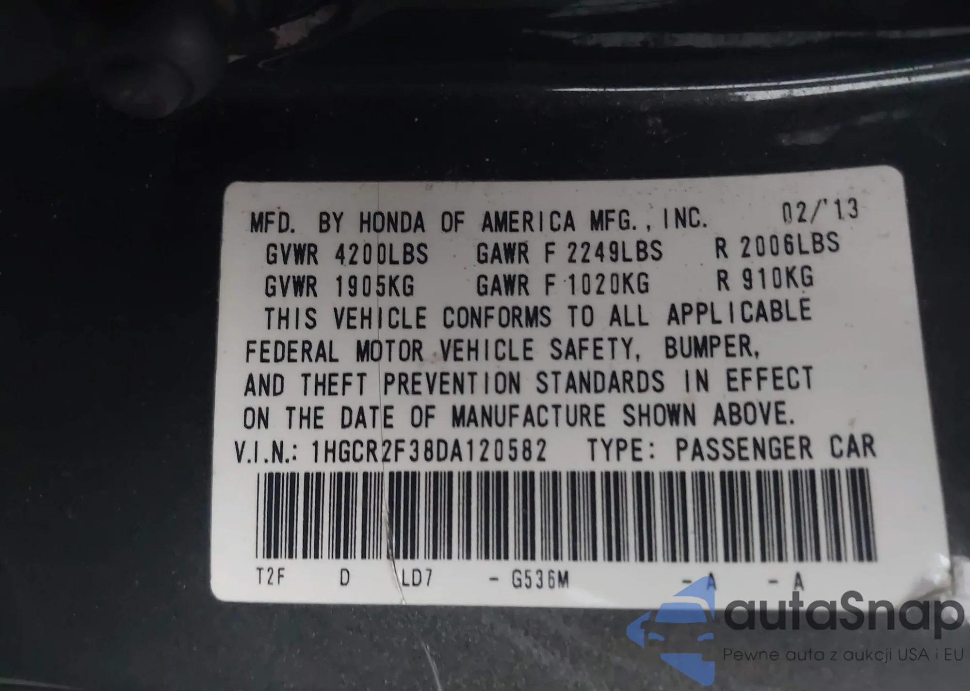 LOT: 44024150 VIN: 1HGCR2F38DA120582