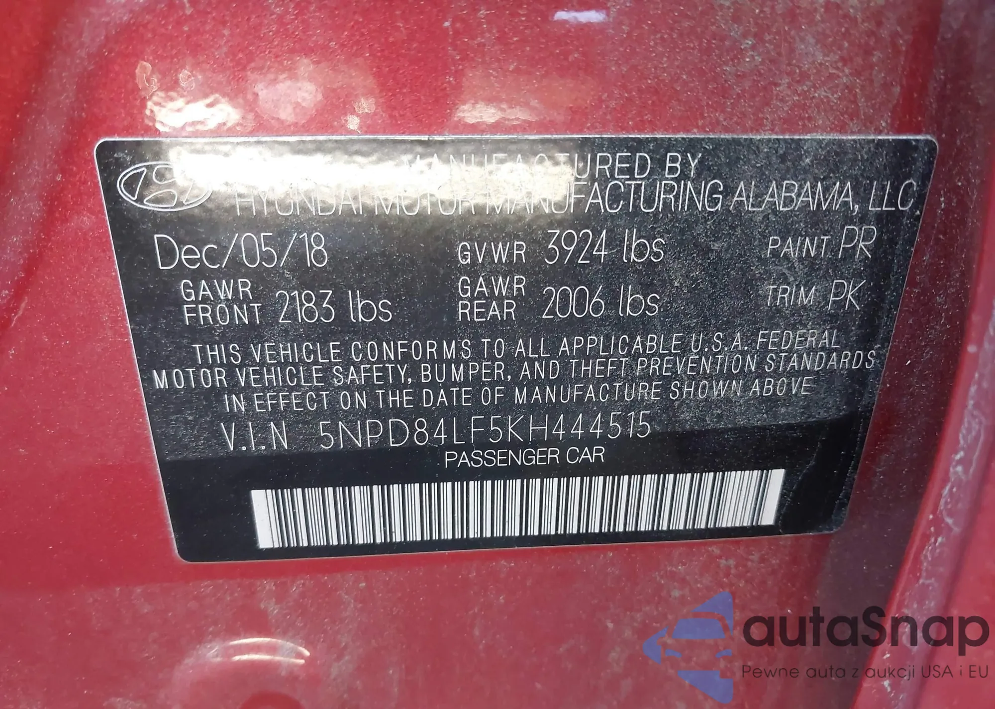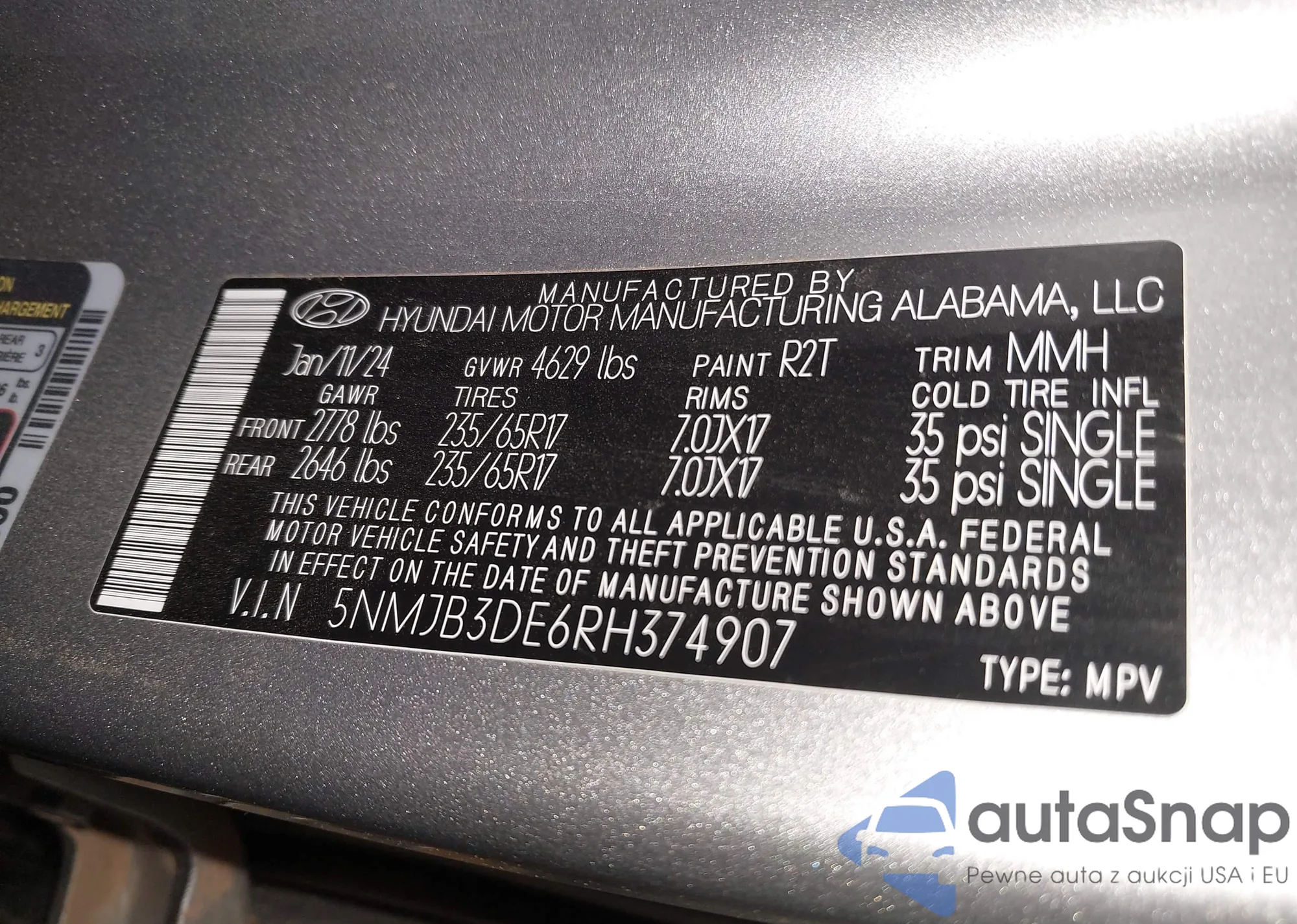 • VIN 5NMJB3DE6RH374907