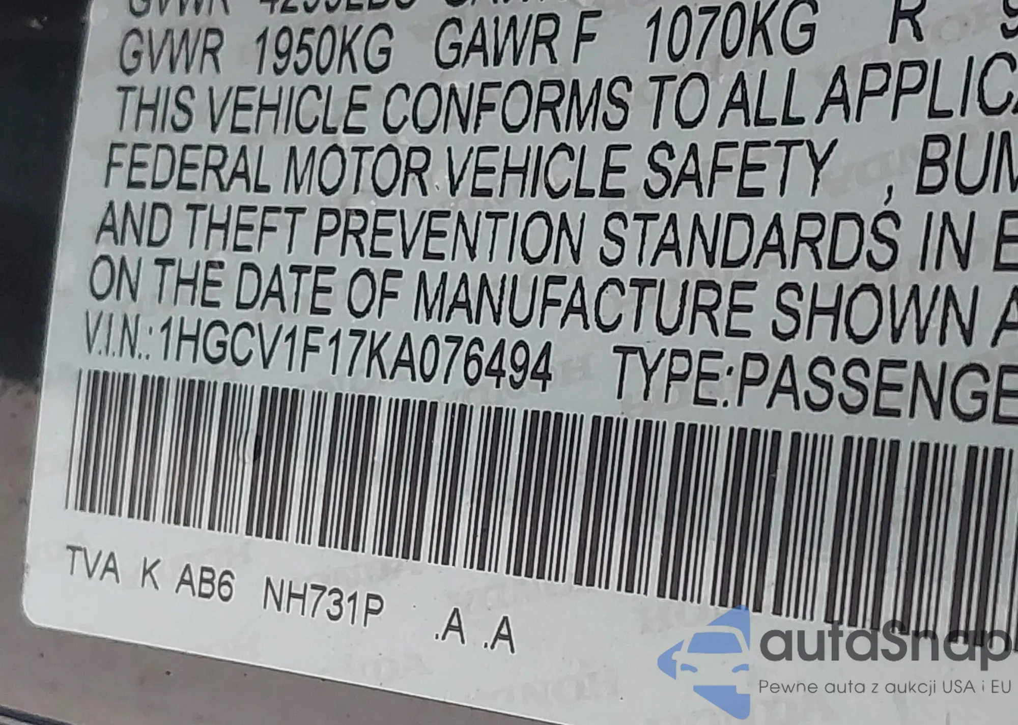 • VIN 1HGCV1F17KA076494