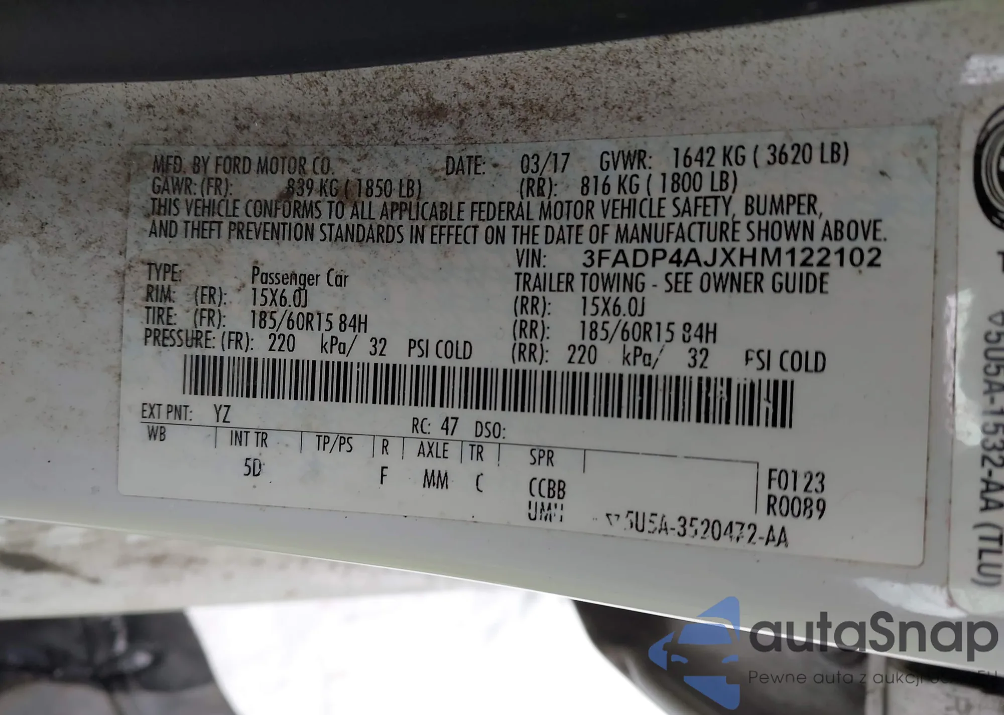 LOT: 43869476 VIN: 3FADP4AJXHM122102