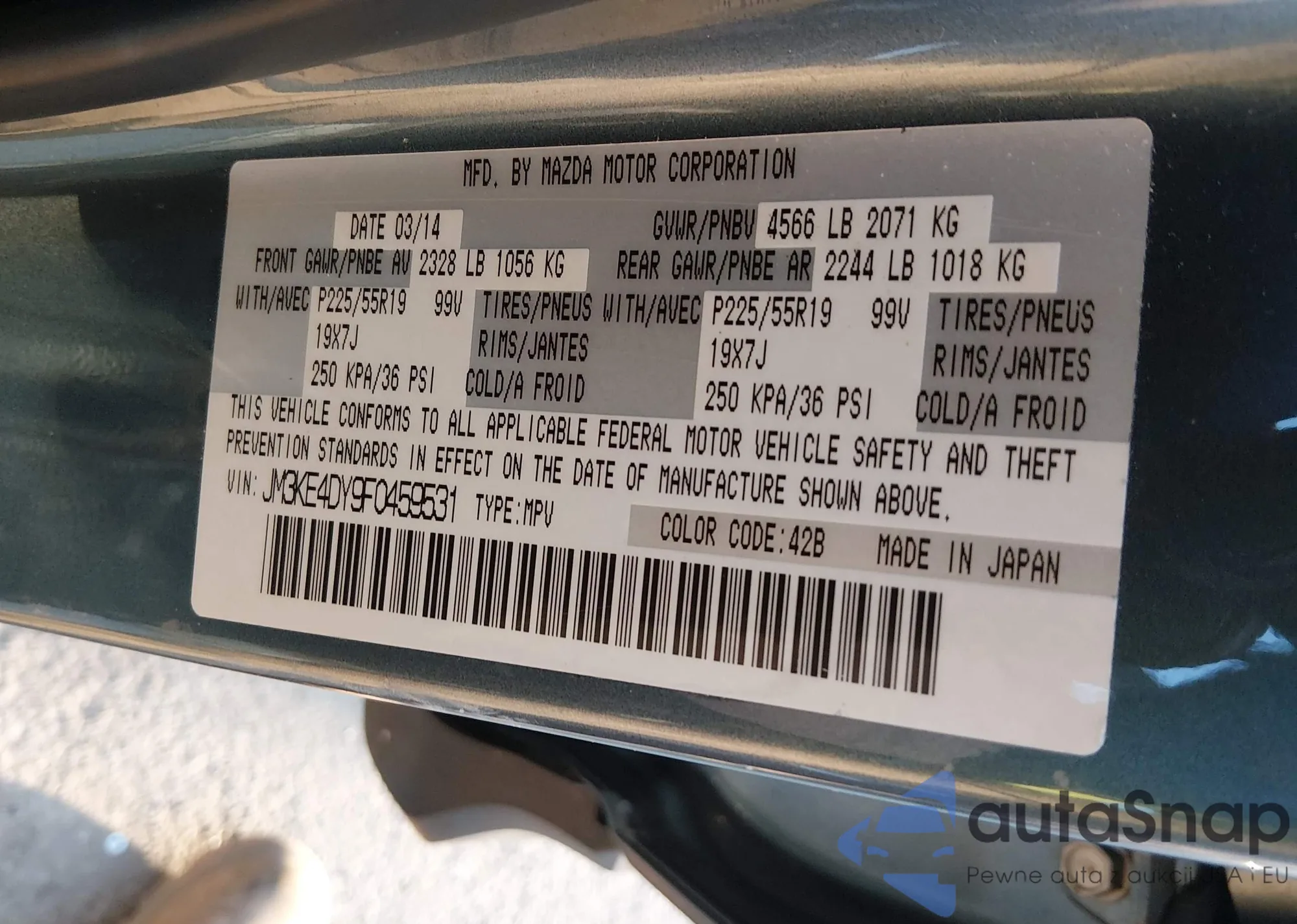 LOT: 44005459 VIN: JM3KE4DY9F0459531