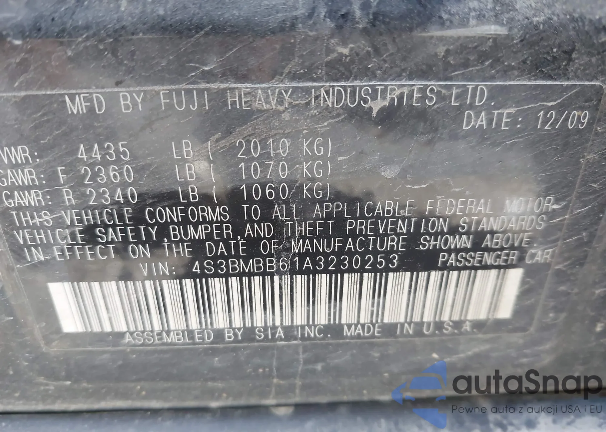 • VIN 4S3BMBB61A3230253