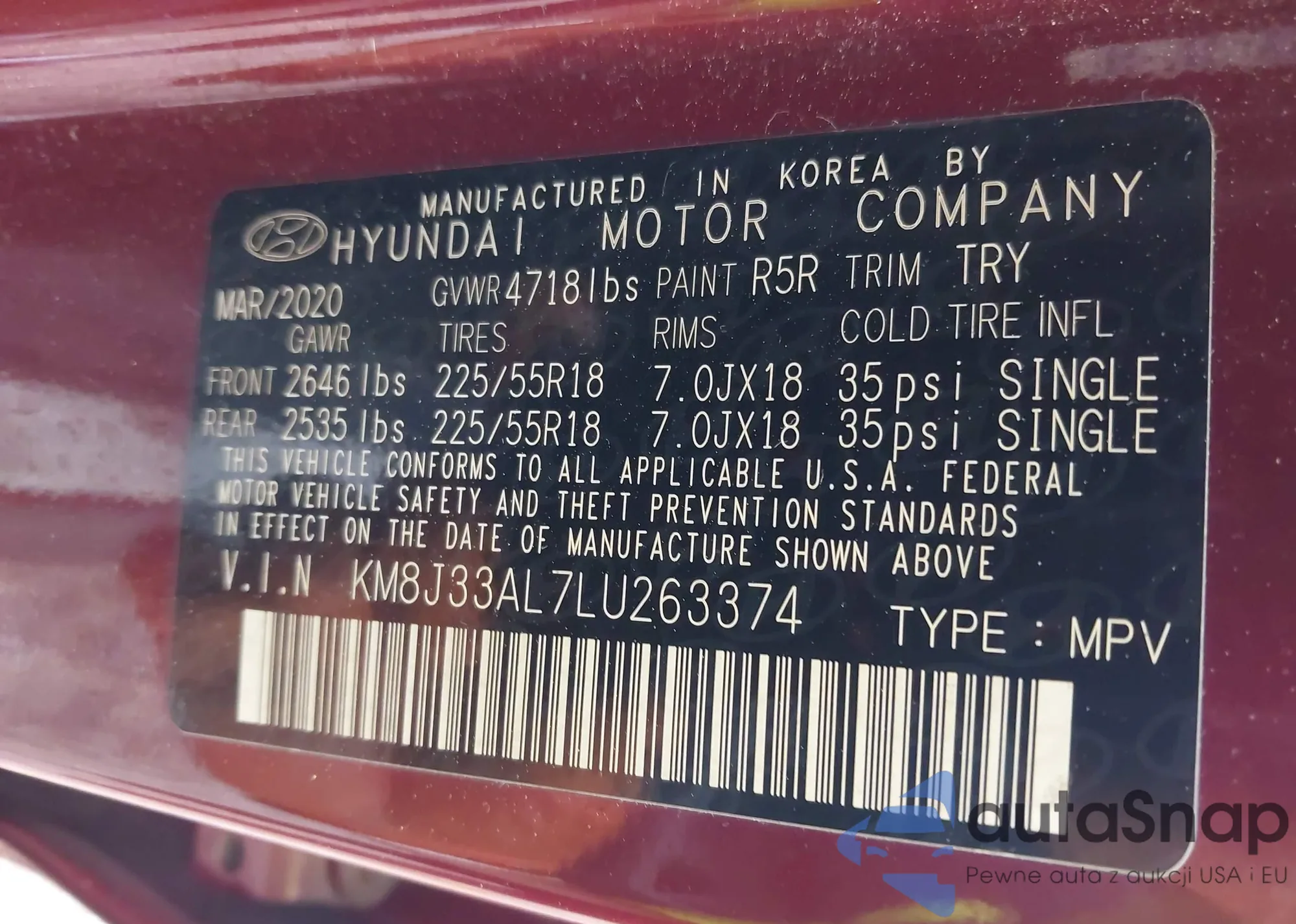 • VIN KM8J33AL7LU263374
