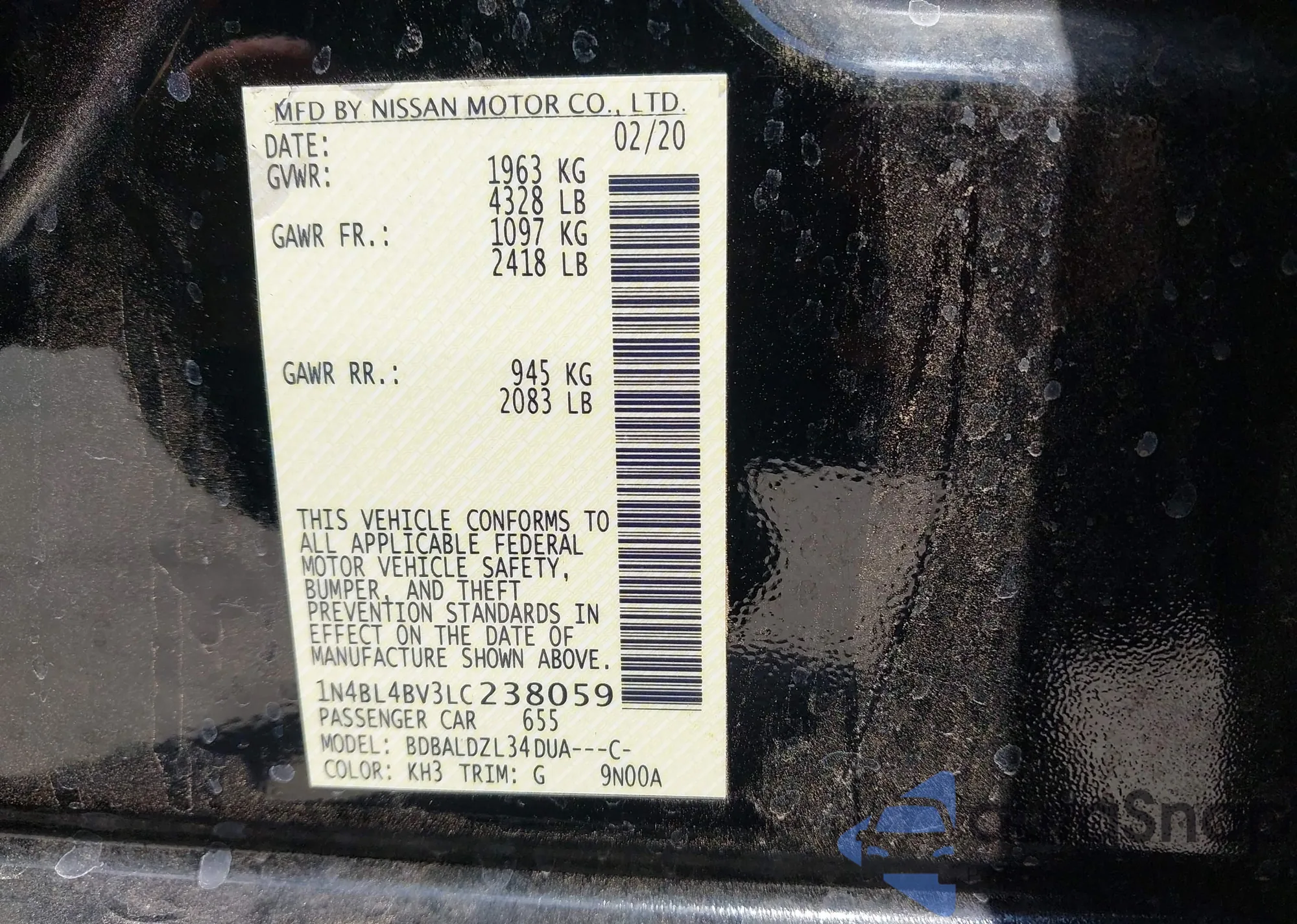 • VIN 1N4BL4BV3LC238059