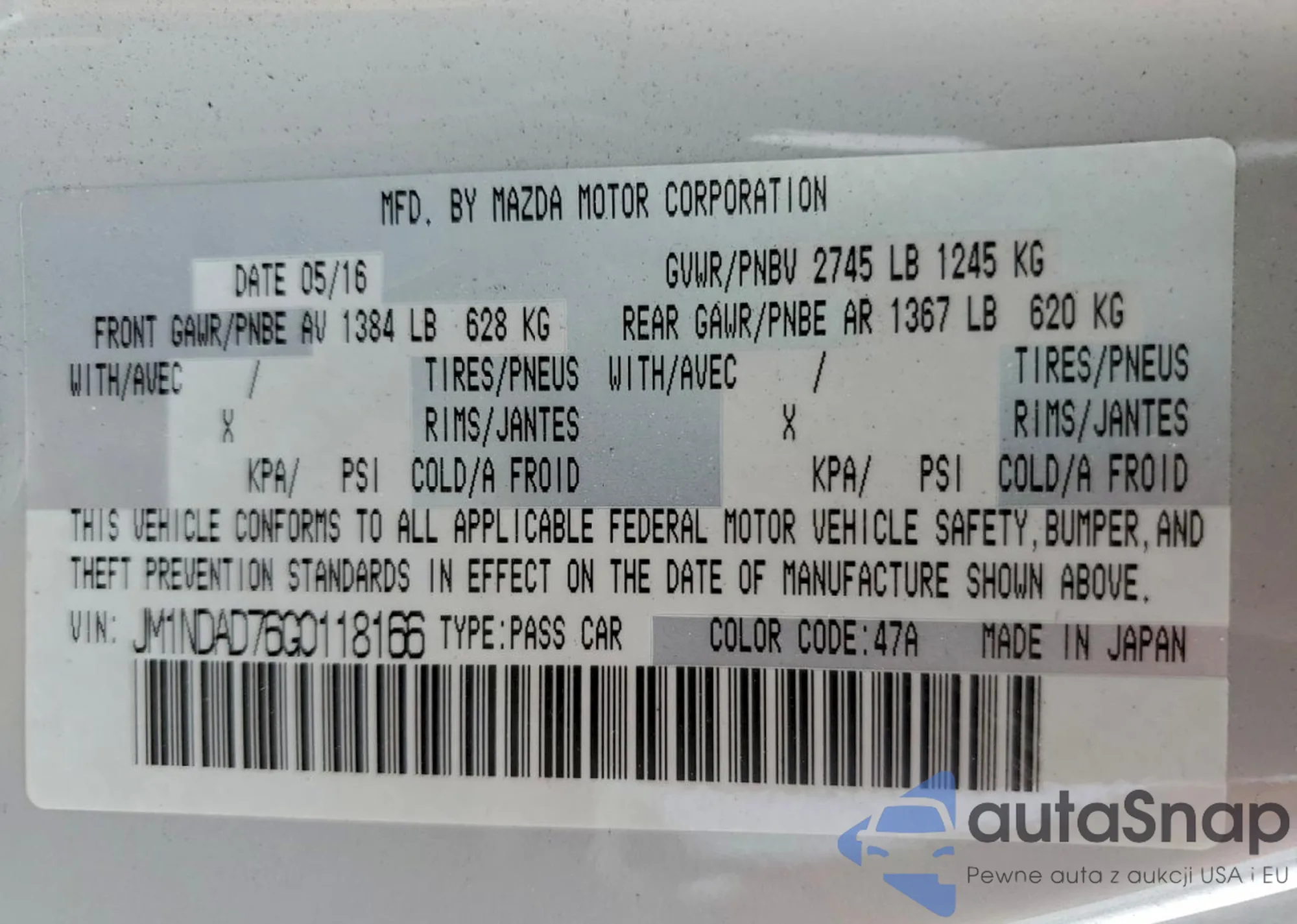 LOT: 94174605 VIN: JM1NDAD76G0118166
