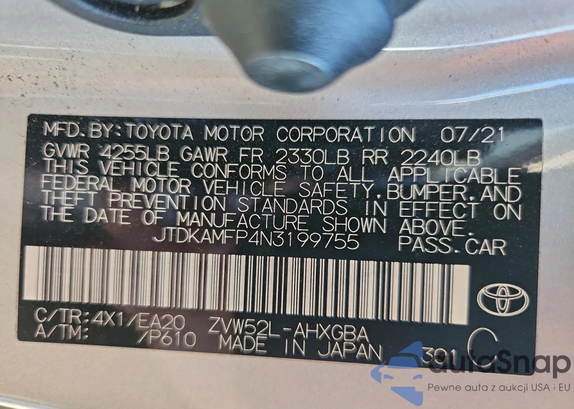 LOT: 99828395 VIN: JTDKAMFP4N3199755