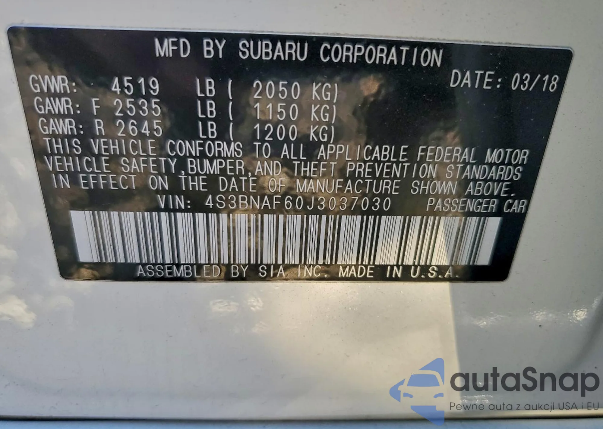 LOT: 97557945 VIN: 4S3BNAF60J3037030