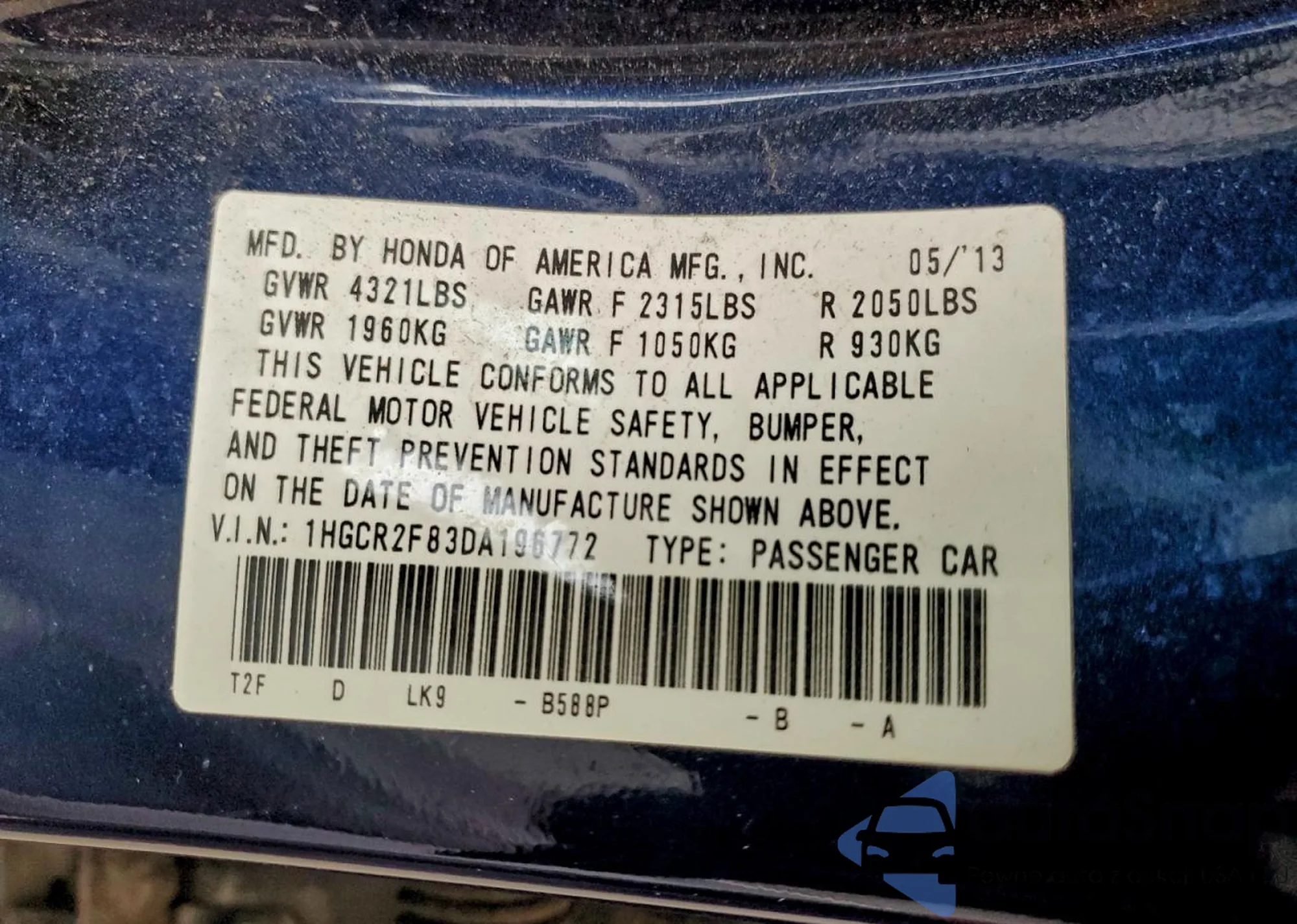 LOT: 99550885 VIN: 1HGCR2F83DA196772