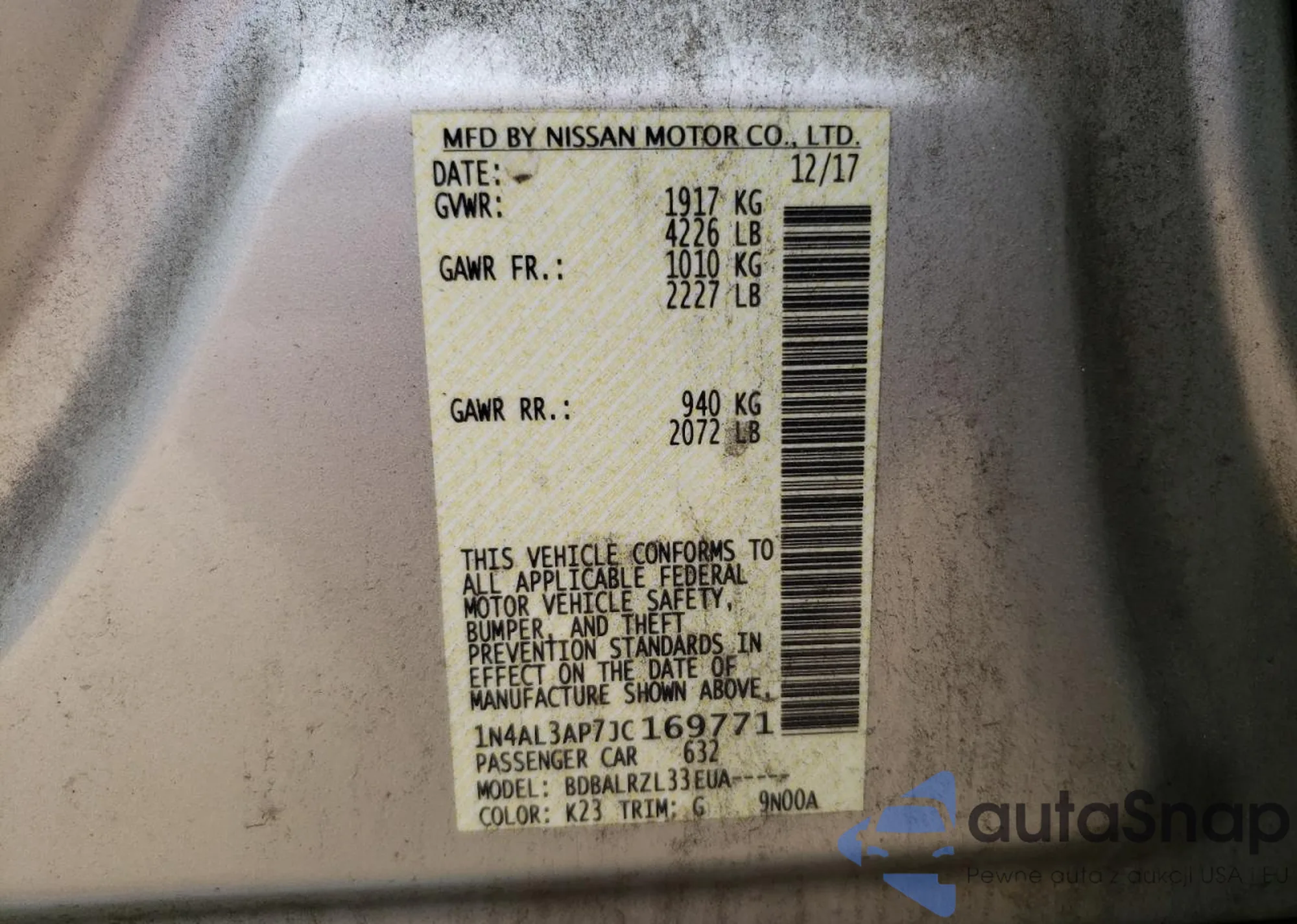 • VIN 1N4BL4BV6LC175247