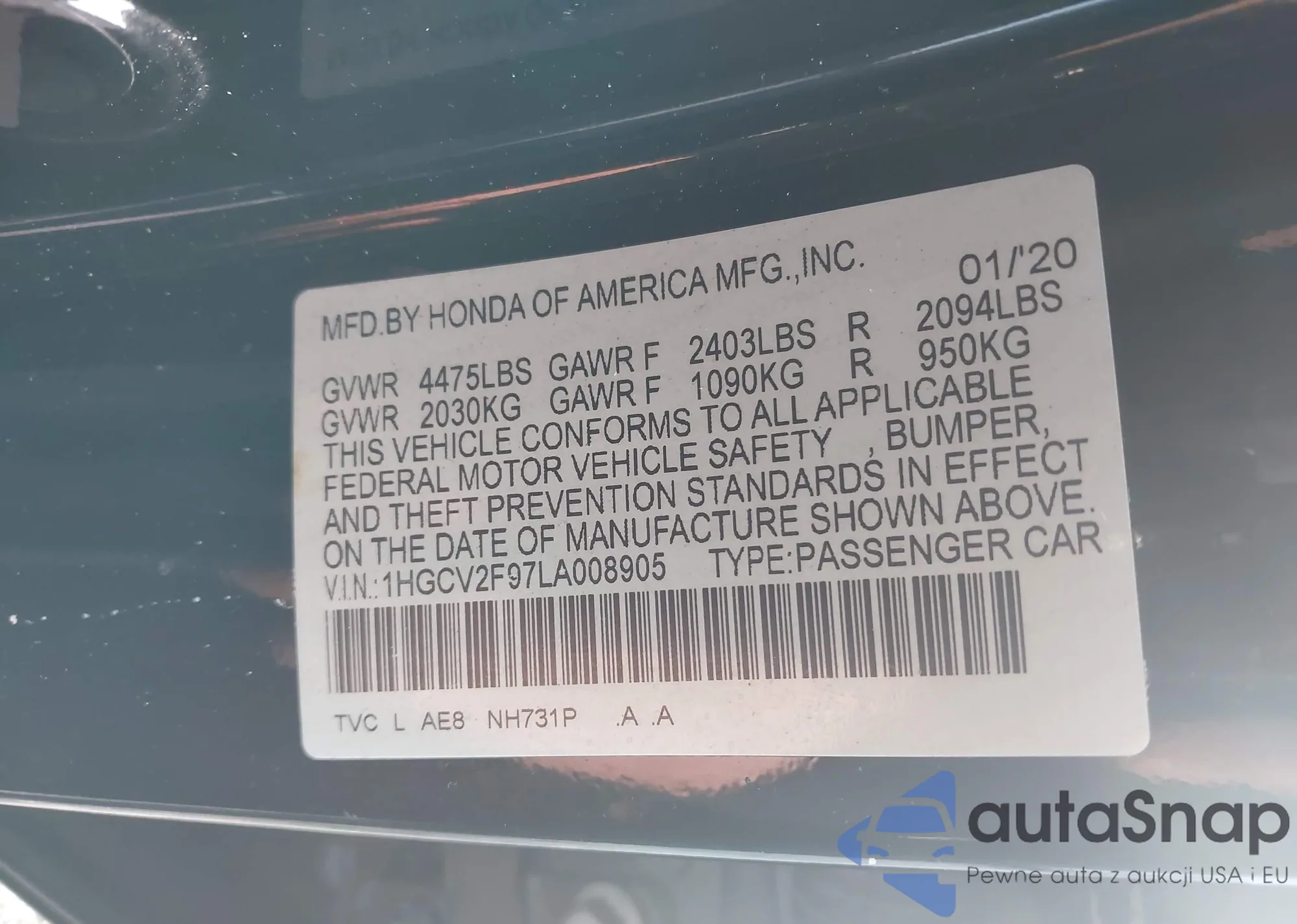 • VIN 1HGCV2F97LA008905