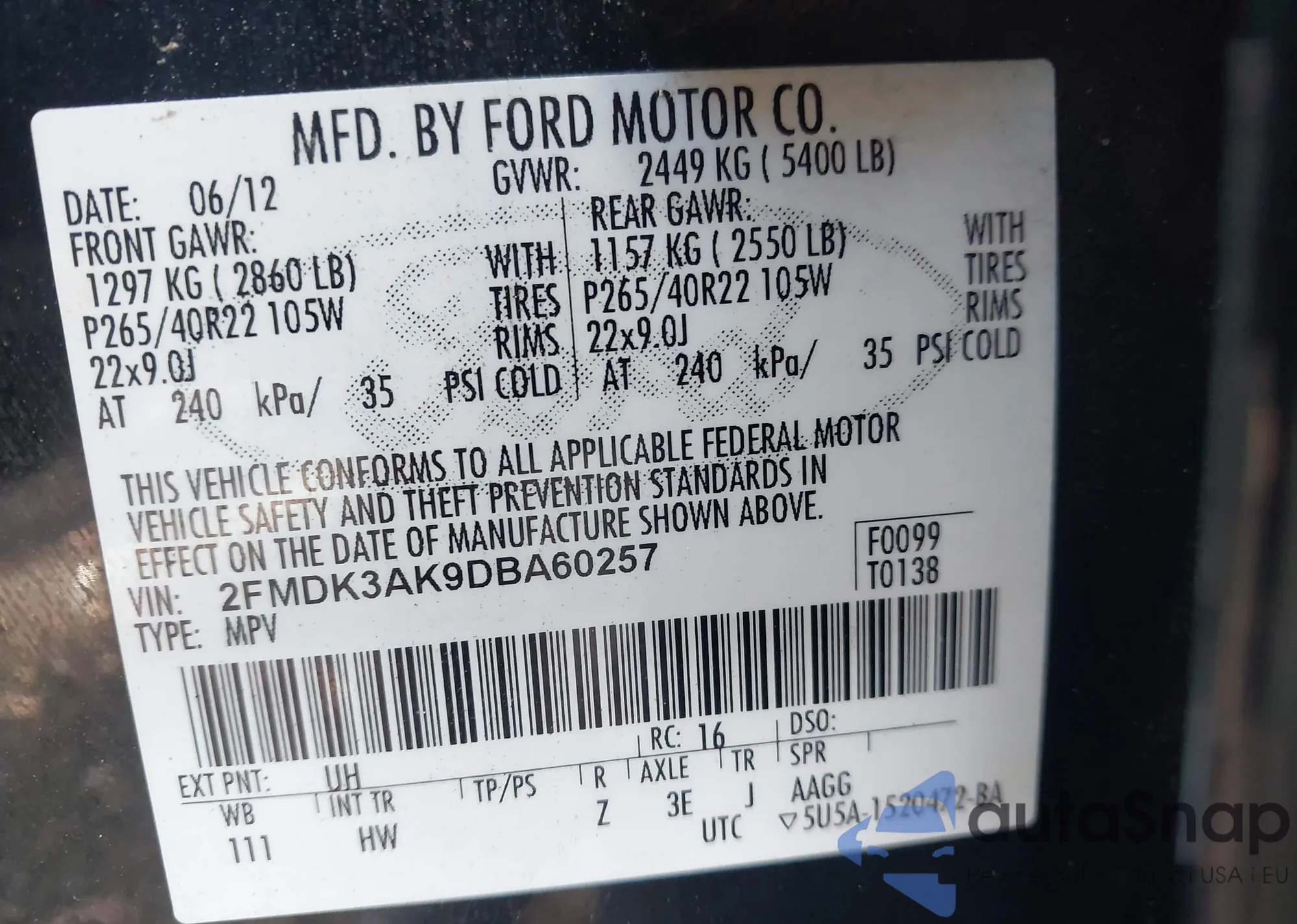 • VIN 2FMDK3AK9DBA60257