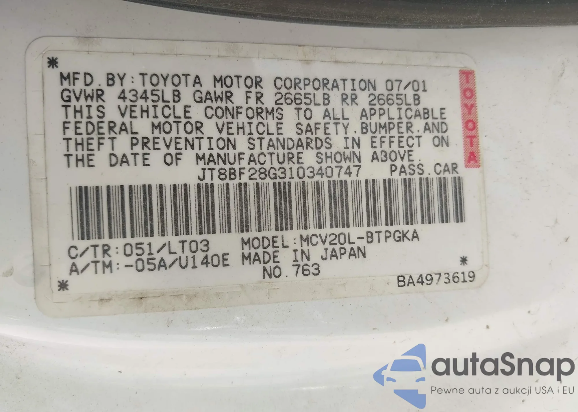 LOT: 44057302 VIN: JTDKN3DU0A1231890
