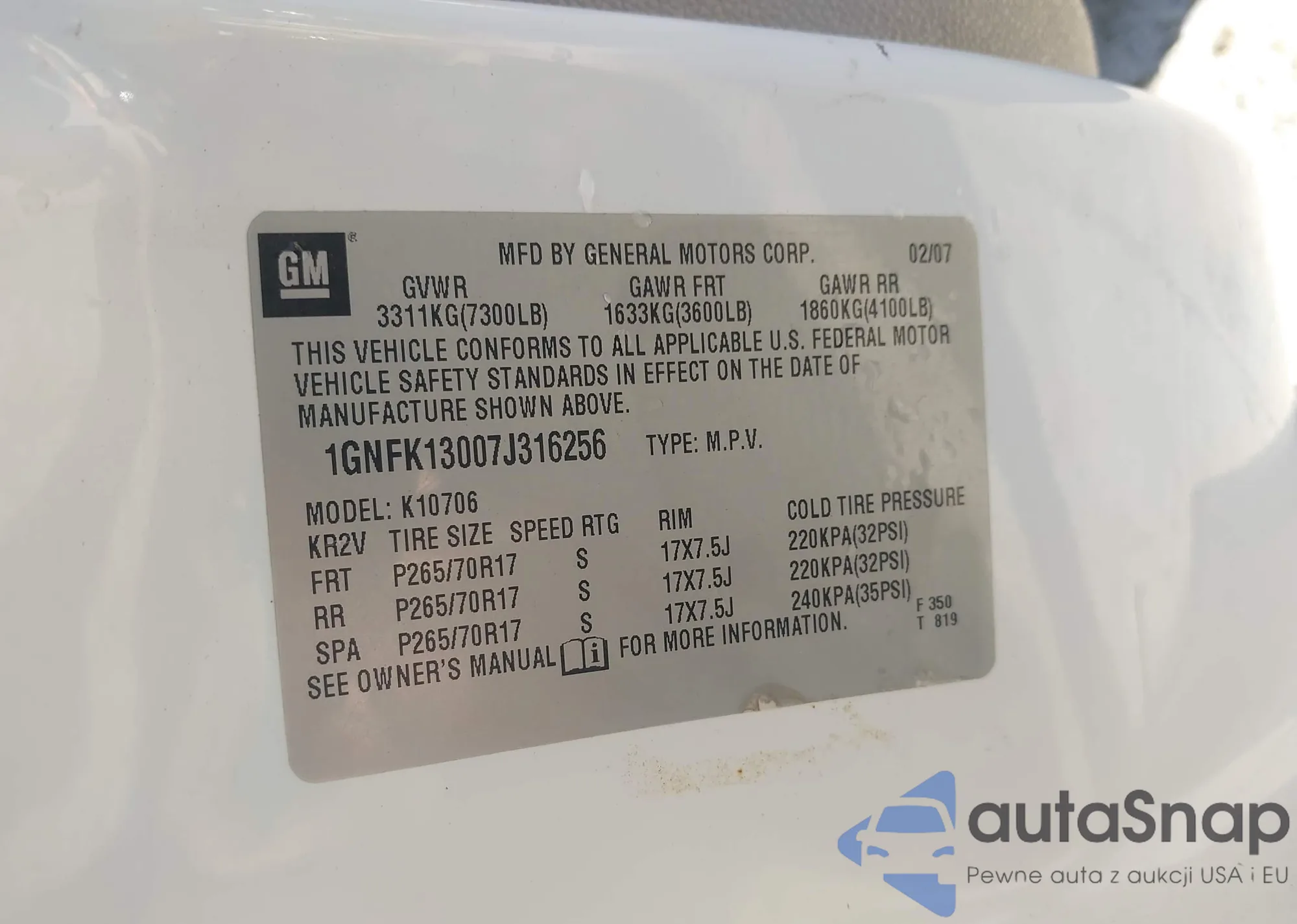 LOT: 43912197 VIN: 1GNFK13007J316256