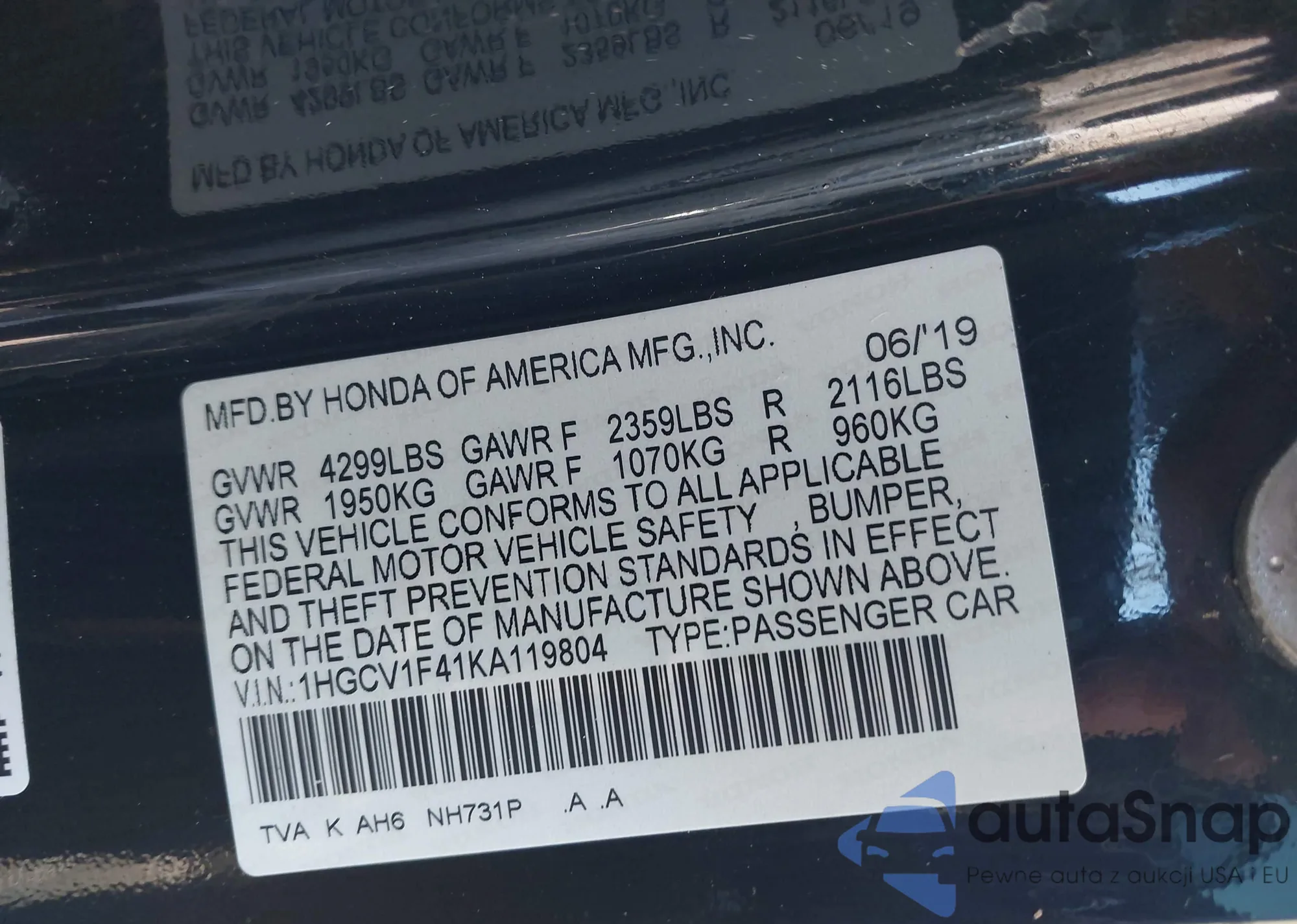 LOT: 43716838 VIN: 1HGCV1F41KA119804