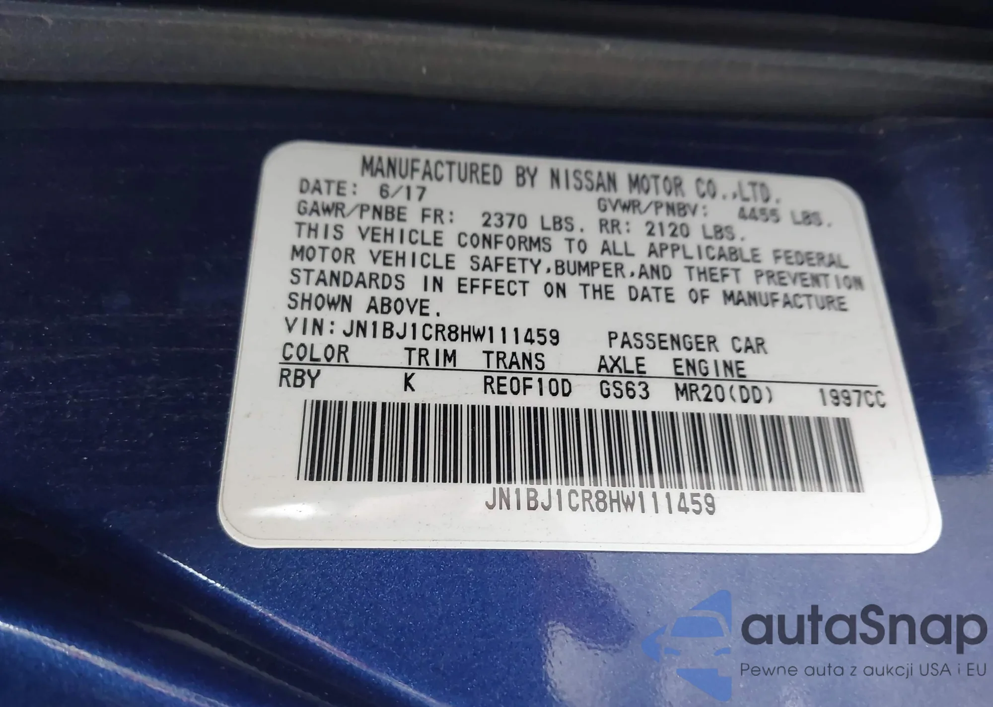 LOT: 43719596 VIN: JN1BJ1CR8HW111459